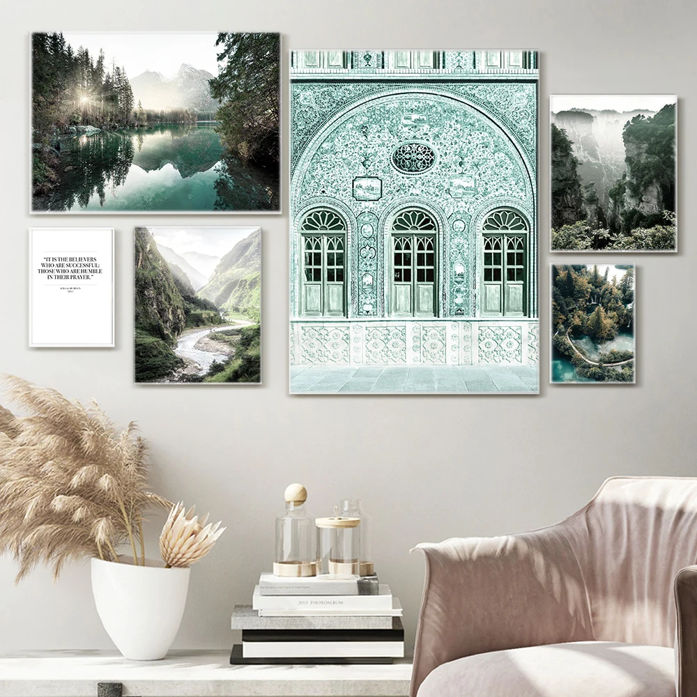 Настенная Картина на холсте, с изображением свежего зеленого озера, леса, дверей, гор, постеры и плакаты печать, Картина Настенная для гостиной, домашний декор