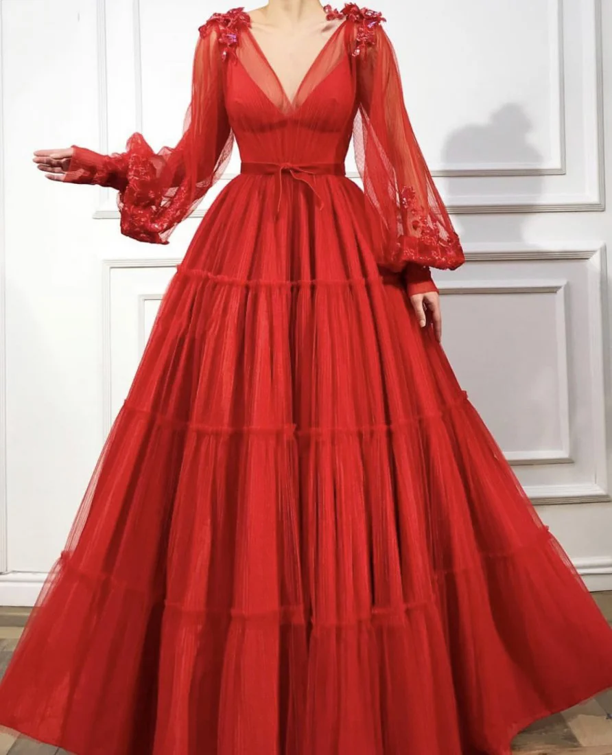 Мусульманское вечернее платье-трапеция красного цвета с длинными рукавами и V-образным вырезом, Тюлевое длинное платье для выпускного вечера