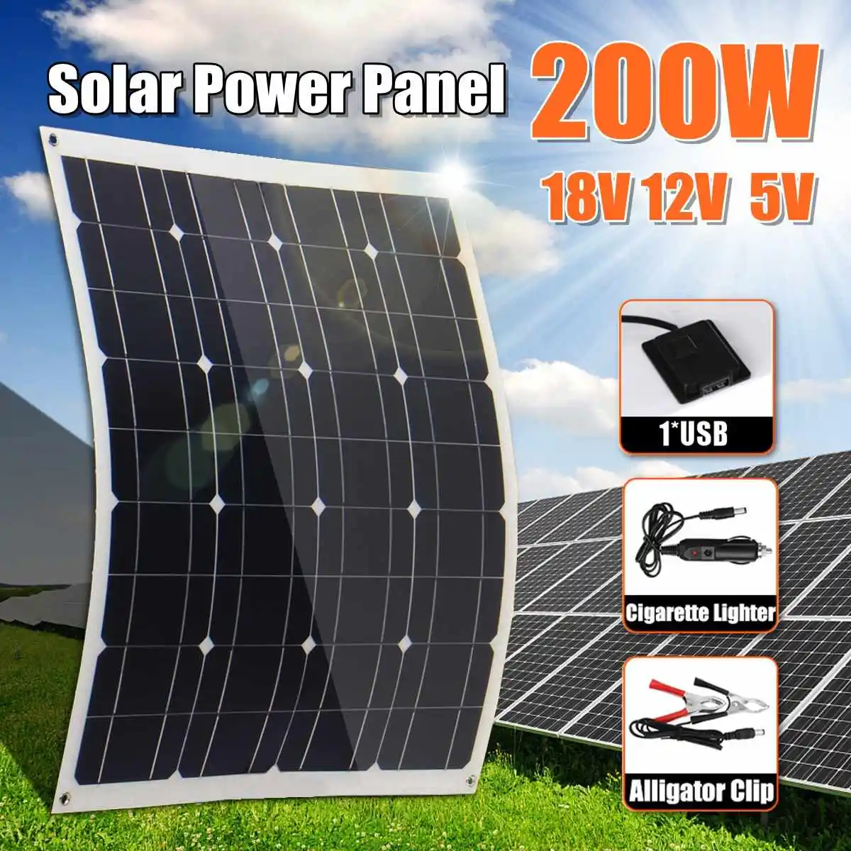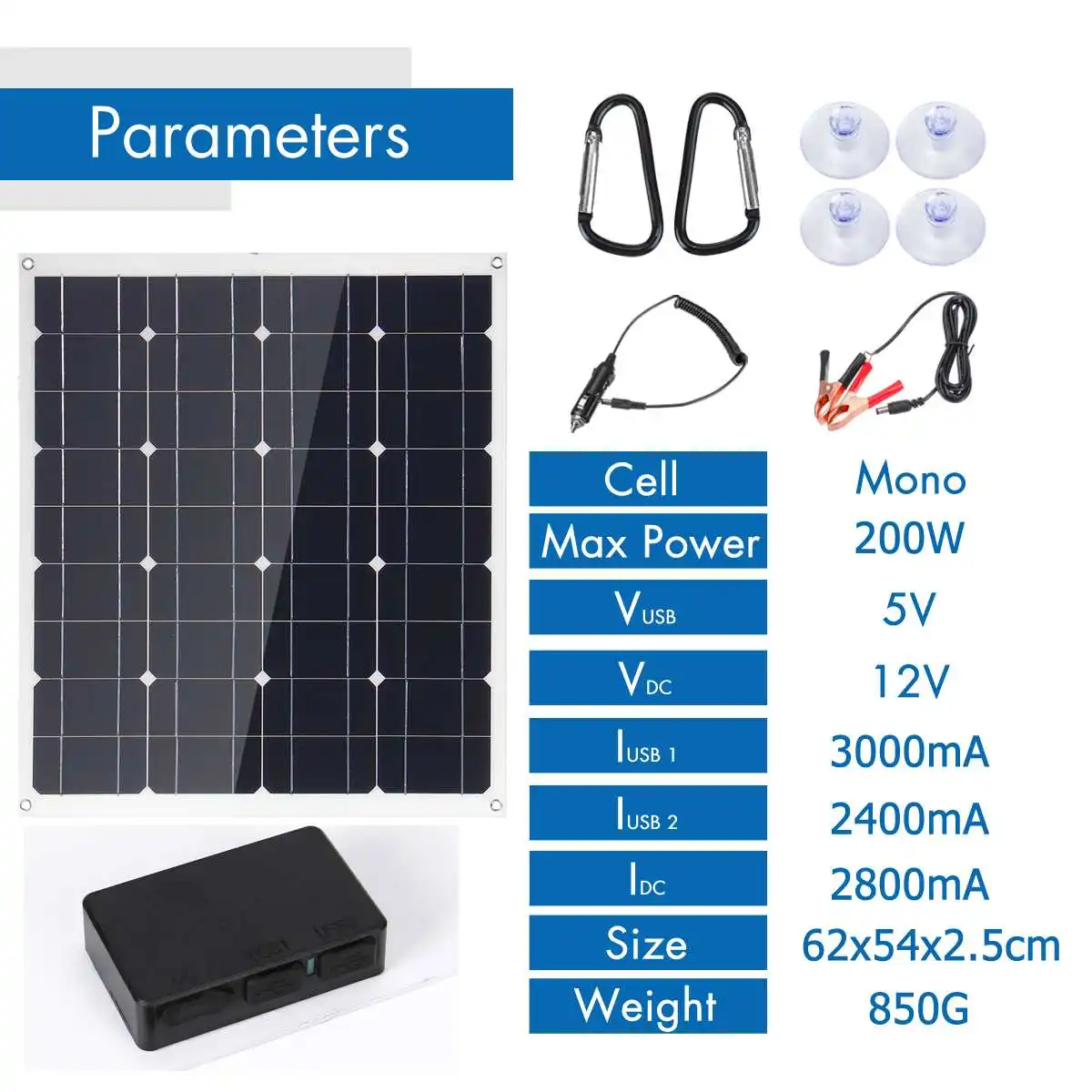 Набор солнечных панелей 200Вт, портативных, монокристаллических, 18В, с одним или двумя разъемами USB, с контролером с ЖК-дисплеем, 20А