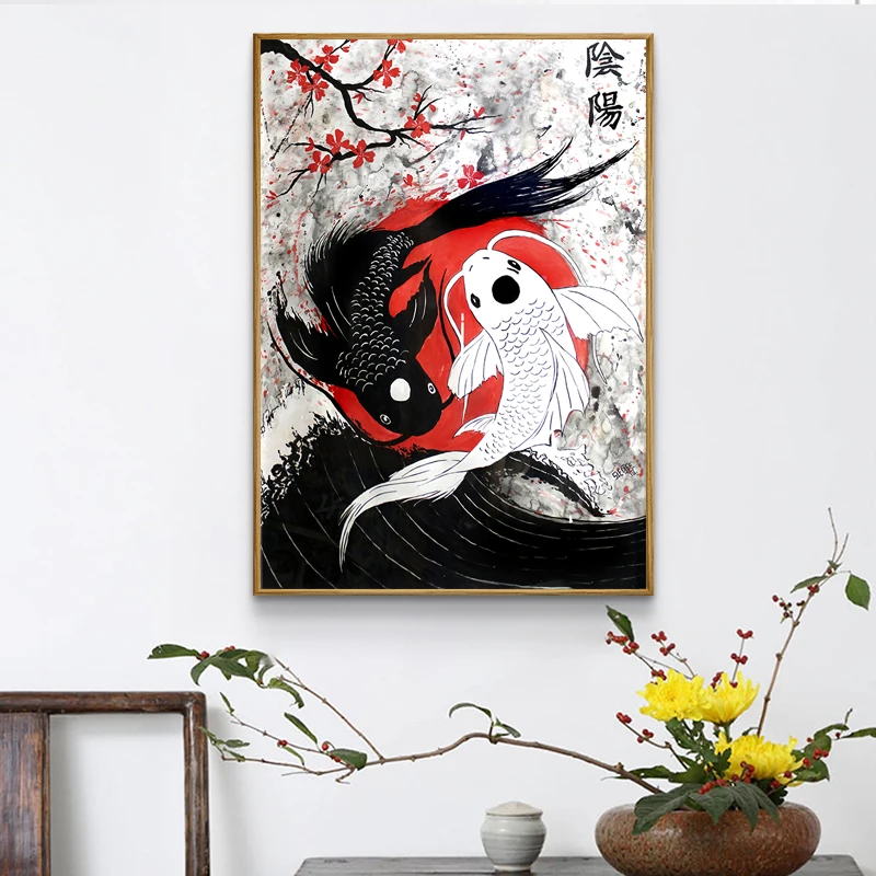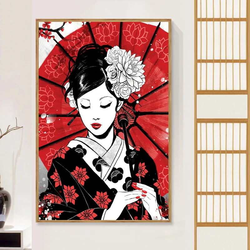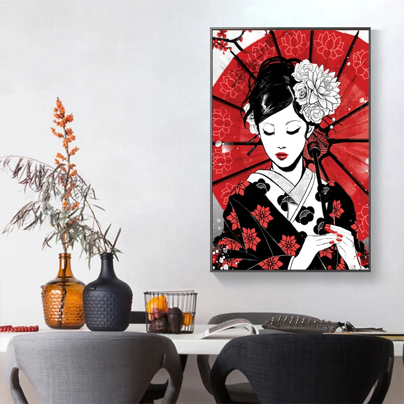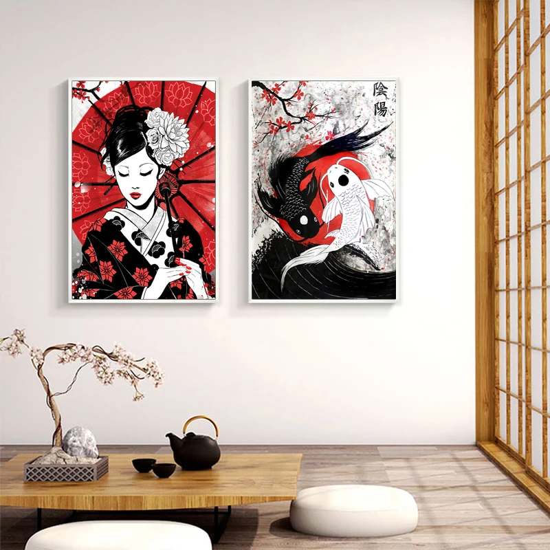 Японский Зонт гейши, девушка и рыба Инь-Ян, искусство, печать на холсте, живопись, Настенная картина, гостиная, современный плакат для украшения дома