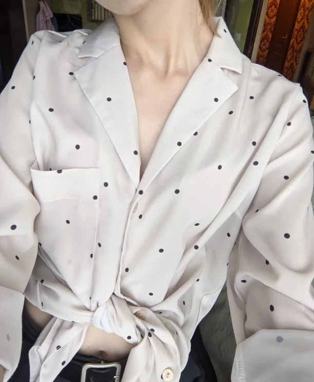 Заказ пришел меньше чем за 20 дней. Рубашка красивая, швы аккуратные, никаких дефектов. Ткань мягкая, струящаяся, но синтетическая (на бирке 50% хлопка), электризуется. Слегка просвечивает. Размер S на мои параметры (78-60-89) сел свободно, но плечи на месте, так что сойдёт.
