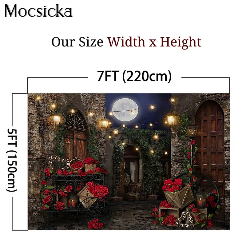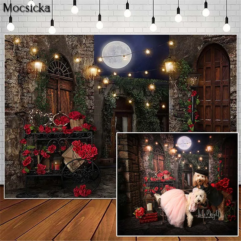 Фон для фотосъемки с изображением романтического города ночного валентинка, красной розы