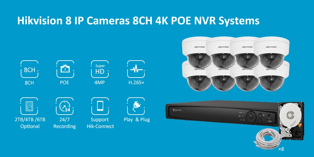 Hikvision IP Security Kit 4K 8-канальный POE NVR Hikvision 4-мегапиксельная IP-камера для внутреннегонаружного подключения Hik-Plug and Play H.265