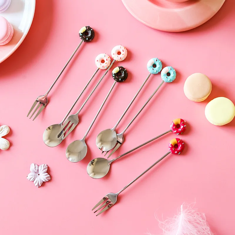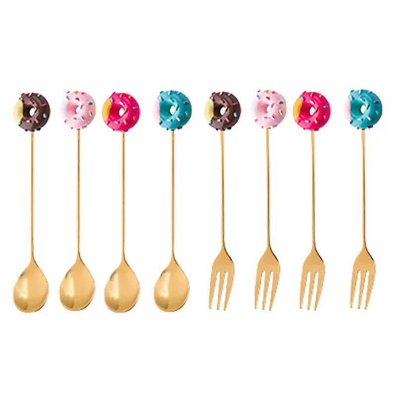 Нержавеющая сталь мультфильм Пончик милые посуда из кукурузного крахмала Mini креативная фруктовая десертная ложка столовая вилка комплект ювелирных изделий золото аксессуары для кухни