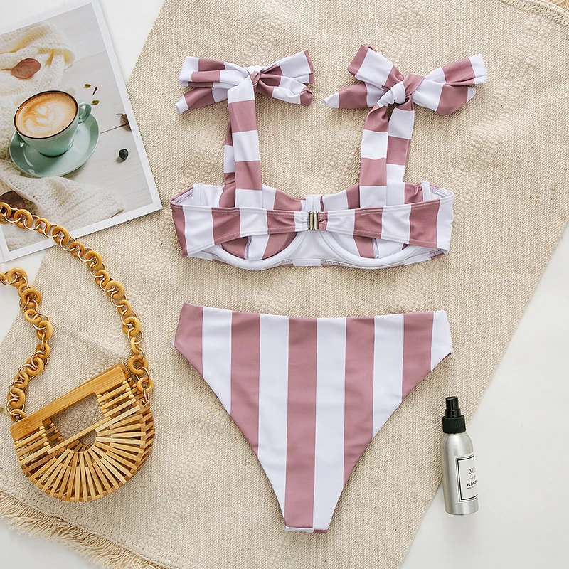 Купальник женский в полоску, комплект для плавания с высокой талией, пуш-ап, с узлом, на косточках, 2021