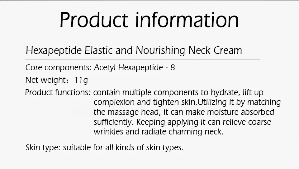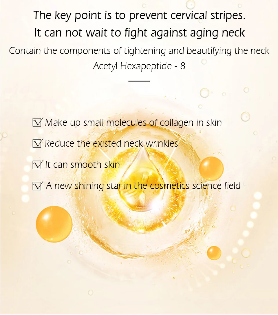 Содержит компоненты затягивания и украшения шеи -- ацетил гексапептид-8 1. Макияж небольших молекул коллагена в коже 2. Уменьшение существующих морщин на шее 3.это может сгладить кожу 4.A новая блестящая Звезда в области косметики