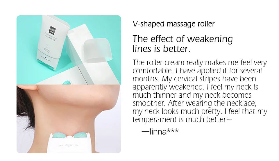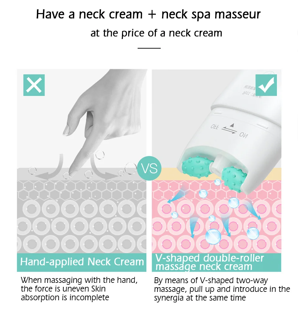 По цене крема для шеи 1. Крем для шеи, нанесенный вручную при массаже рукой, усилие неровное. Поглощение кожи является неполным. 2. V-образный двухроликовый массажный крем для шеи с помощью v-образного двухстороннего массажа, подтягивайте и вводите в эффект эффекта одновременно.