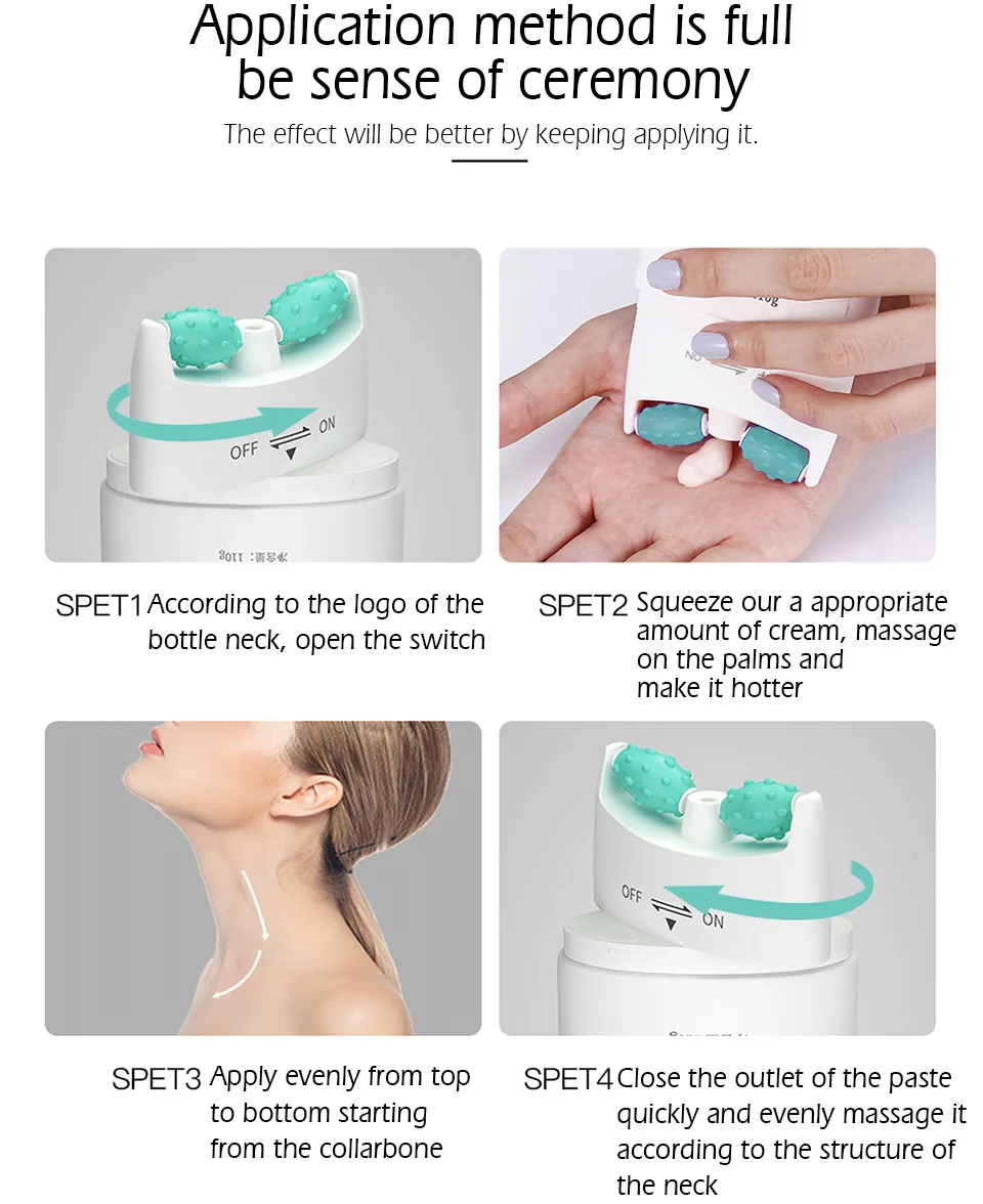 Эффект будет лучше, сохраняя его применение. 1. К логотипу горлышка бутылки Откройте переключатель 2. Выдавите необходимое количество крема, массируйте на ладонях и сделайте его более горячим 3. Нанесите равномерно сверху вниз, начиная с ключицы 4. Закройте отверстие пасты быстро и равномерно массируйте ее в соответствии со структурой шеи