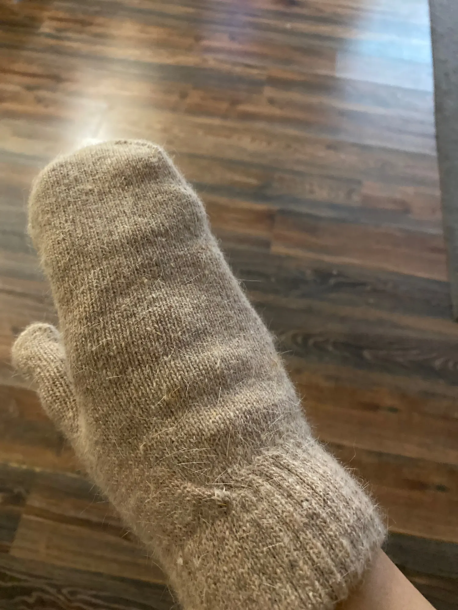 Очень тёплые. Пахнут шерстью. Внутри подкладка из хлопка. Но они на небольшие руки.