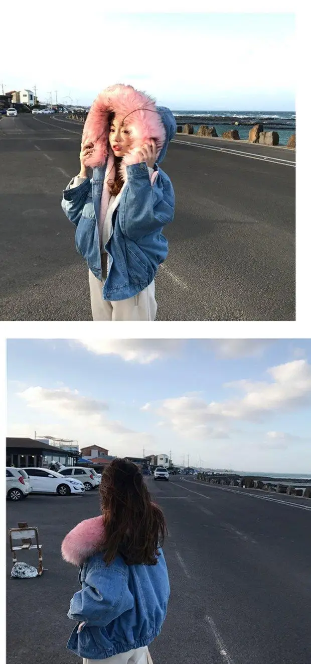 Женская джинсовая куртка с большим воротником из искусственного мех...