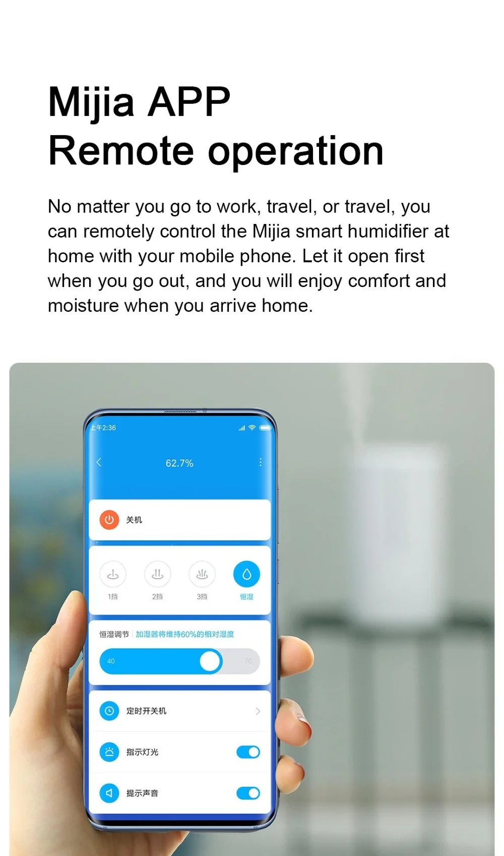 Удаленное управление через приложение Mijia, удаленное увлажнение также может быть выполнено снаружиНезависимо от того, вы идете на работу, путешествия или путешествия, вы можете дистанционно управлять Mijia умный стерилизационный увлажнитель S дома, вынимая ваш мобильный телефон. Вы можете включить его, когда вы находитесь в пути, и вы будете наслаждаться комфортом и влагой дома.Дома есть «маленькие одноклассники любви», увлажнение-это всего лишь одно предложениеПоддержка подключения к Xiao Ai и интеллектуального голосового взаимодействия. Вам нужно только что сказать Сяо Ай, быстро ответить, переключить машину, отрегулировать количество тумана и т. Д., вы можете управлять увлажнением, не вставляя.