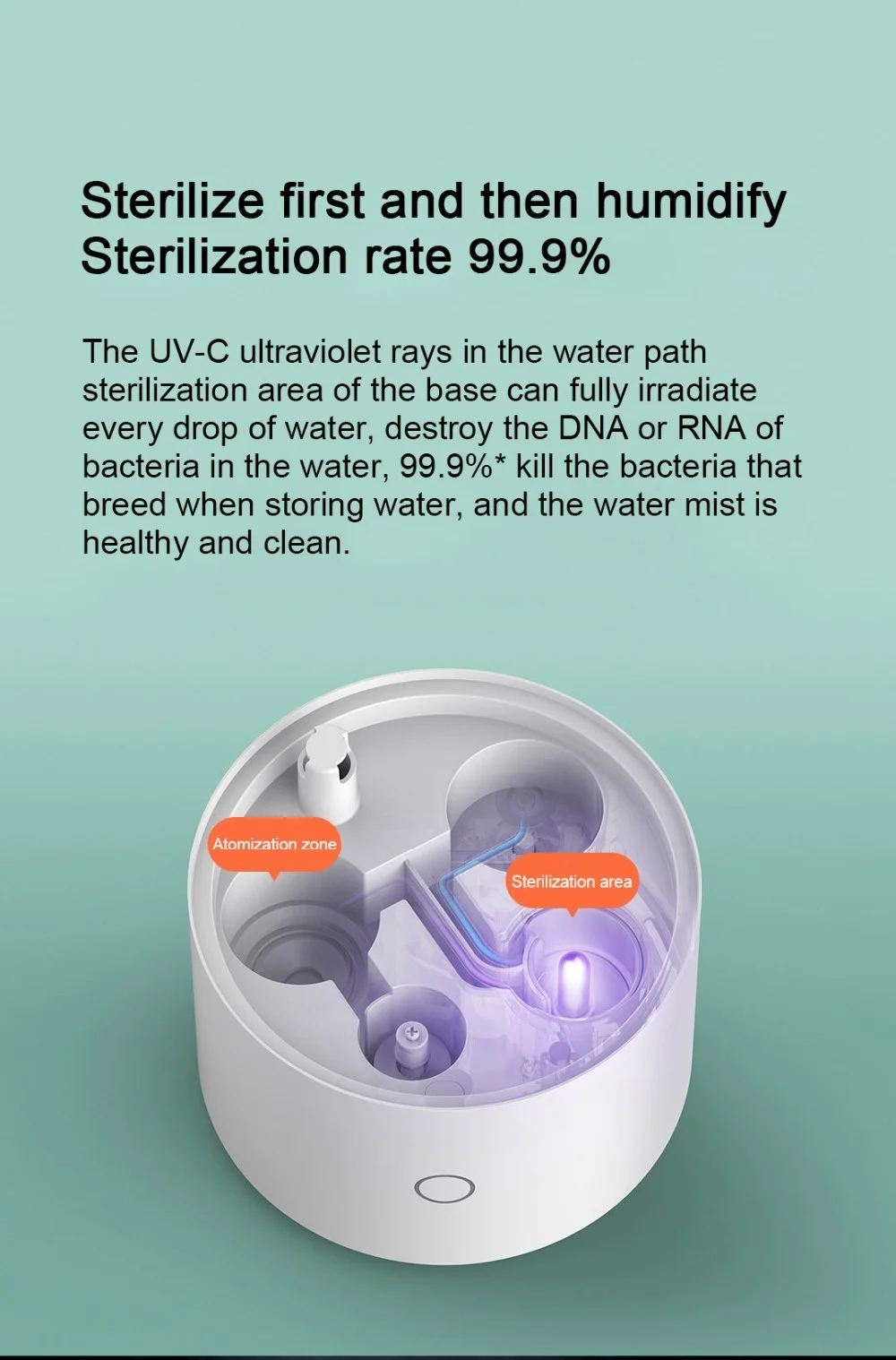 Здоровье заключается в стерилизации, а затем увлажнении, скорость стерилизации составляет 99.9%UV-C ультрафиолетовых лучей в области водной стерилизации основания может полностью облучить каждую каплю воды, разрушить DNA или RNA бактерий в воде, И убивает 99.9% бактерий, которые растут, когда вода хранится. Водный туман является здоровым и чистым.