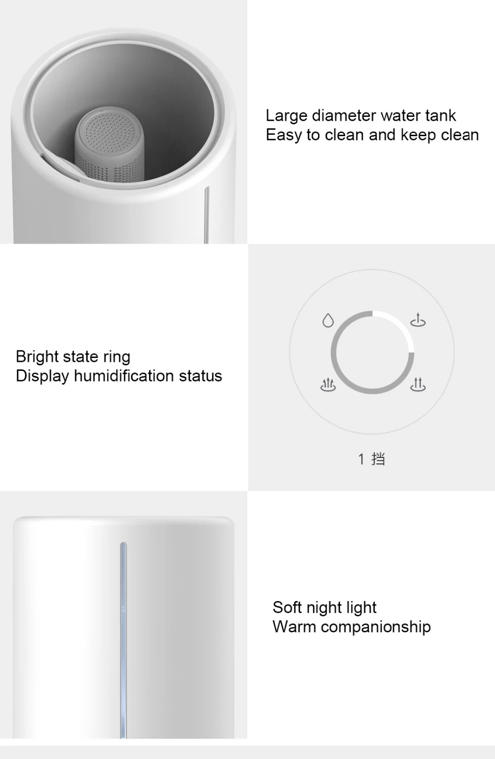 Бак для воды большого диаметра, легко моется и сохраняет чистоту.Яркий статус кольца, очистка показывает состояние увлажнения.Мягкий Ночной светильник, с теплым компаньоном в ночное время