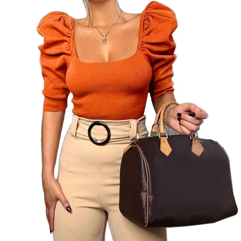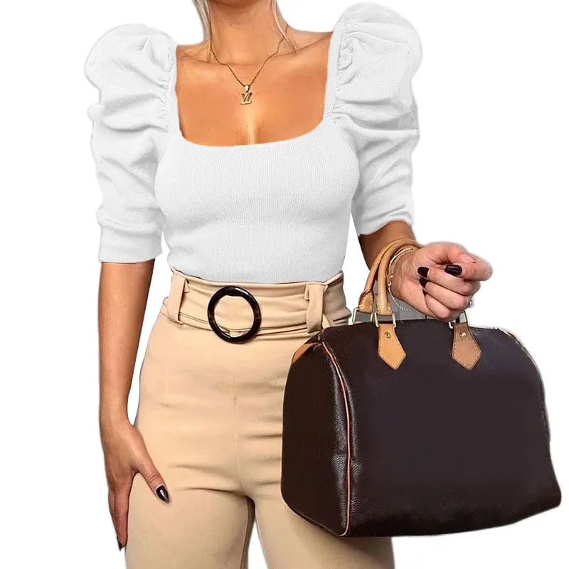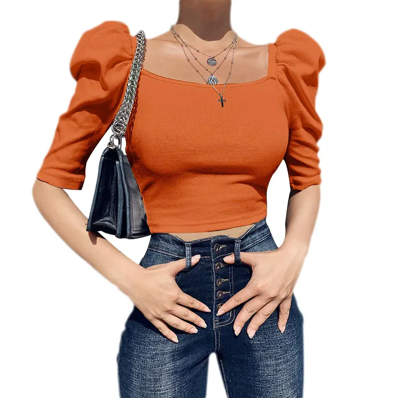 Лидер продаж, Корейская футболка, осень 2020, однотонный винтажный Топ, новые женские футболки, соблазнительные маленькие облегающие Блузы с пышными рукавами и квадратным воротником