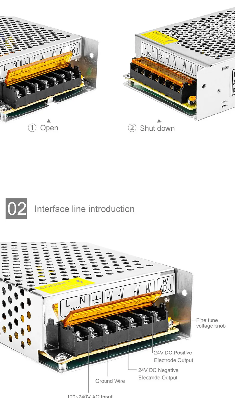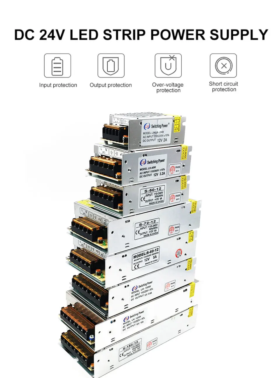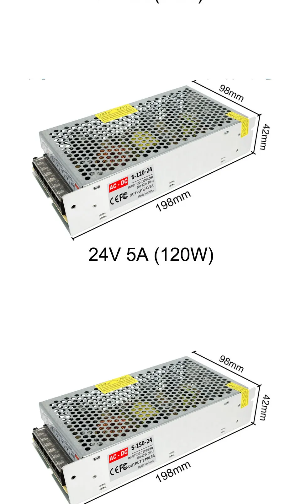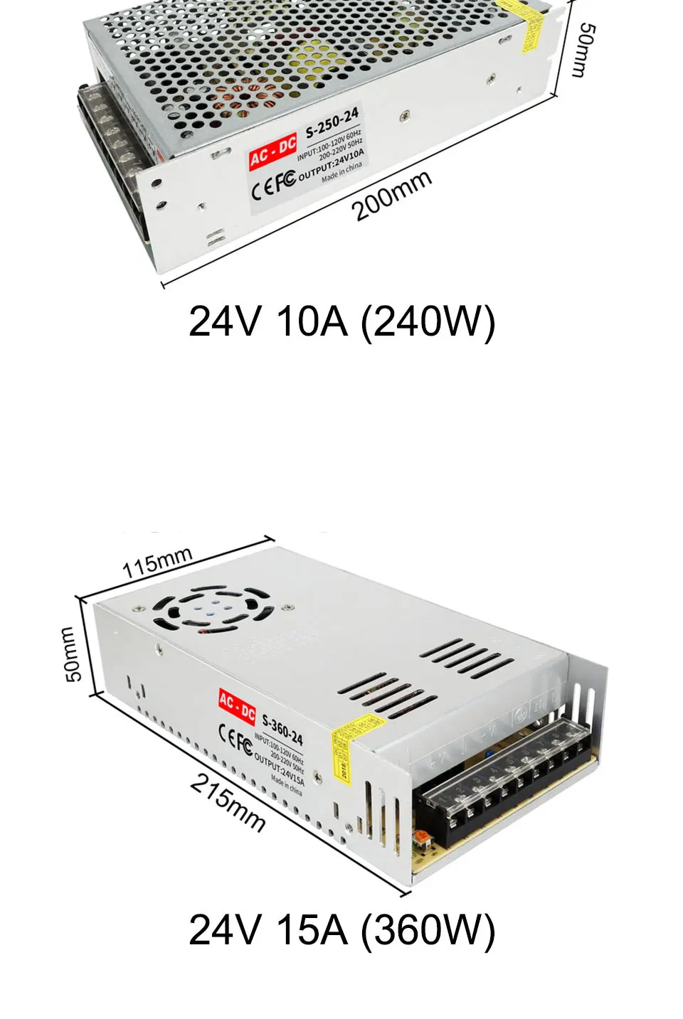 Входное напряжение: AC100V-265VВыходное напряжение: 24 В постоянного токаВыходной ток: 1а-15аМощность: 10 Вт-350 ВтМатериал корпуса: алюминиевый чехолРабочая температура: 0 ~ 40CТемпература хранения: -20 ~ 60CВлажность окружающей среды: 0 ~ 95% без конденсацииСоответствие безопасности: FCC / CE / Rohs