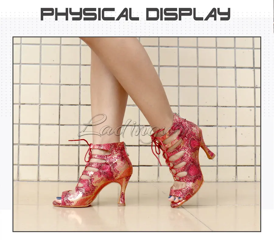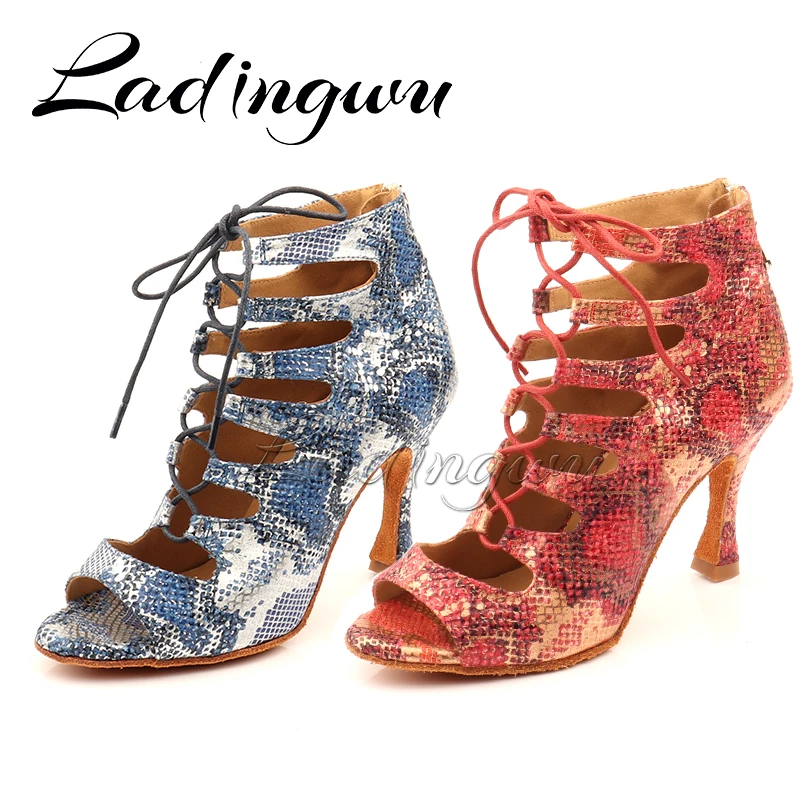 Женские ботинки для латиноамериканских танцев Ladingwu, танцевальные ботинки на мягкой подошве, женские сандалии на молнии, обувь для латиноамериканских танцев, синиекрасные замшевые ботинки со змеиной текстурой