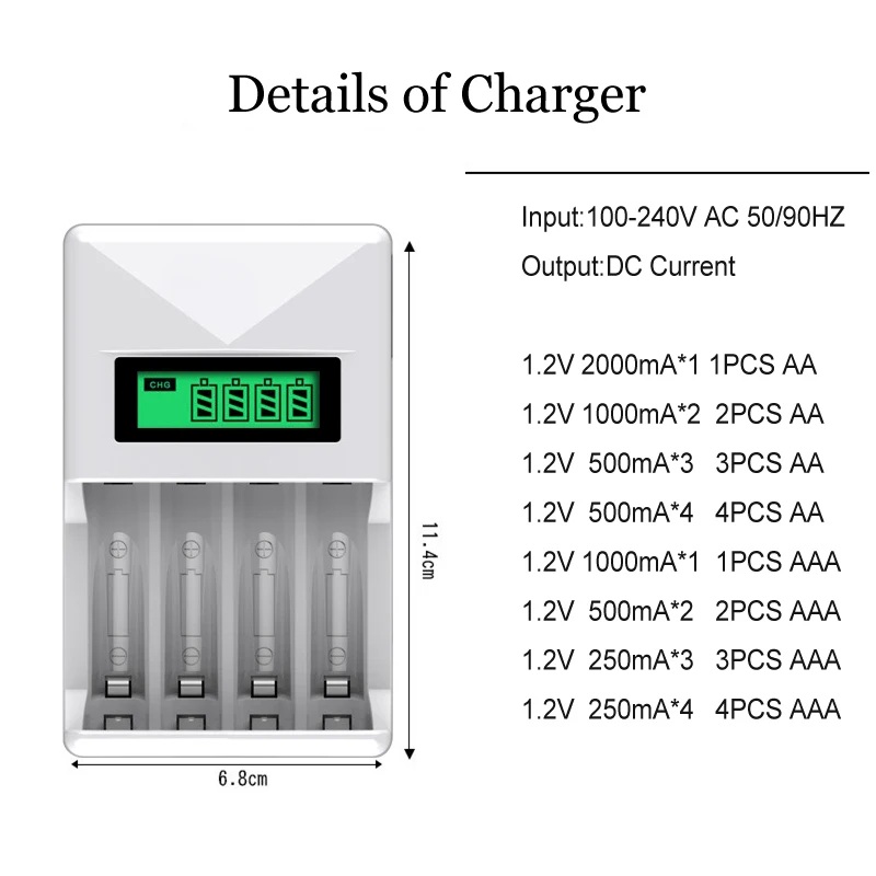 Для AA, AAA, металл-гидридных или никель NI-CD 1,2 V Перезаряжаемые батарея Вход: 100-240 В переменного тока, 50/90 Гц Выход: постоянный ток 1,2 V 2000mA * 1 1 батарейки типа АА 1,2 V 1000mA * 2 2 батарейки типа АА 1,2 V 500mA * 3 3 батарейки типа АА 1,2 V 500mA * 4 4 батарейки типа АА 1,2 V 1000mA * 1 1 шт. AAA 1,2 V 500mA * 2 2 шт. AAA 1,2 V 250mA * 3 3 шт. AAA 1,2 V 250mA * 4 4 шт. AAA