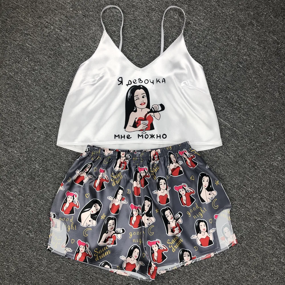 Атласная пижама с мультяшным принтом животных, милая Пижама, домашний костюм, летняя пикантная Пижама с V-образным вырезом, на бретелях-спагетти, свободная Пижама