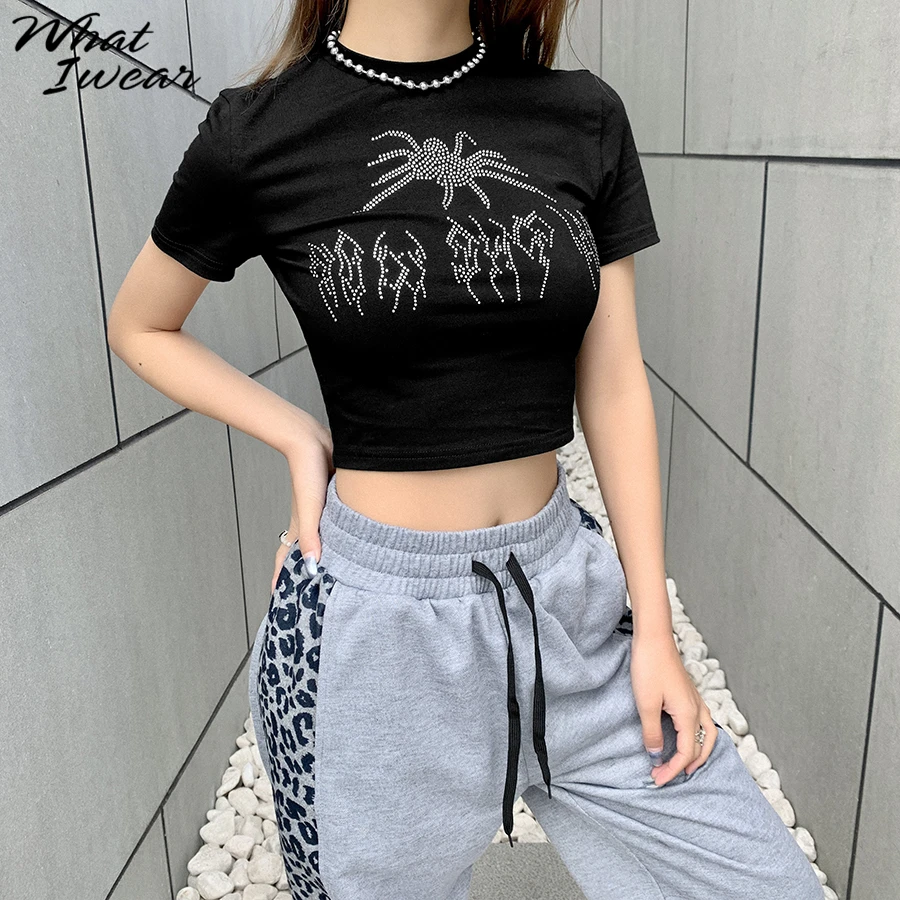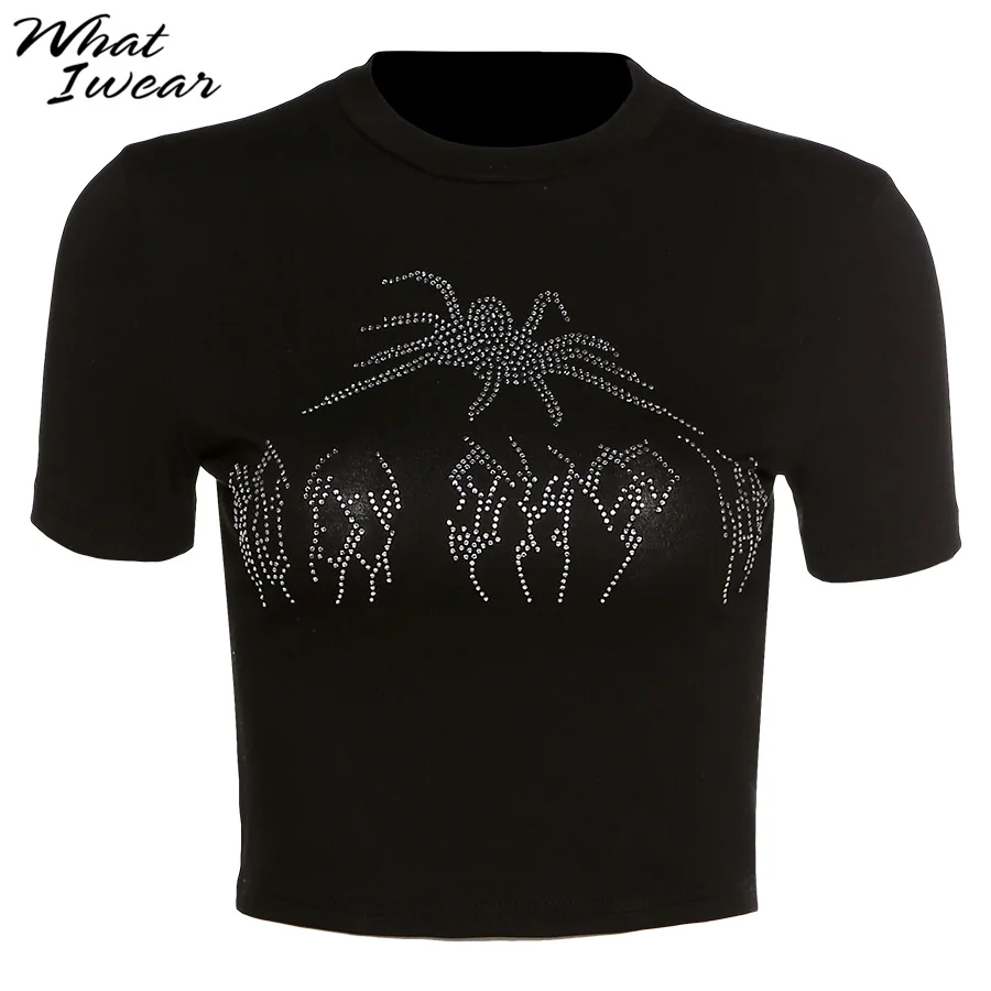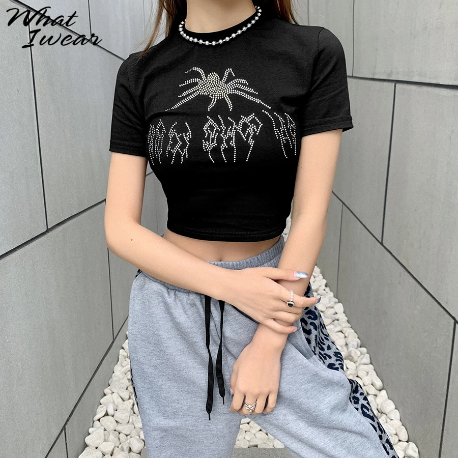 Винтажные черные футболки Стразы с рисунком паука, Mall Goth Y2K, к...