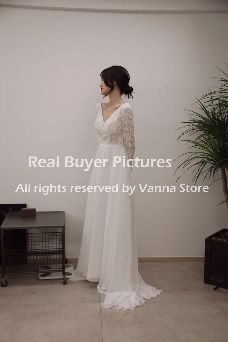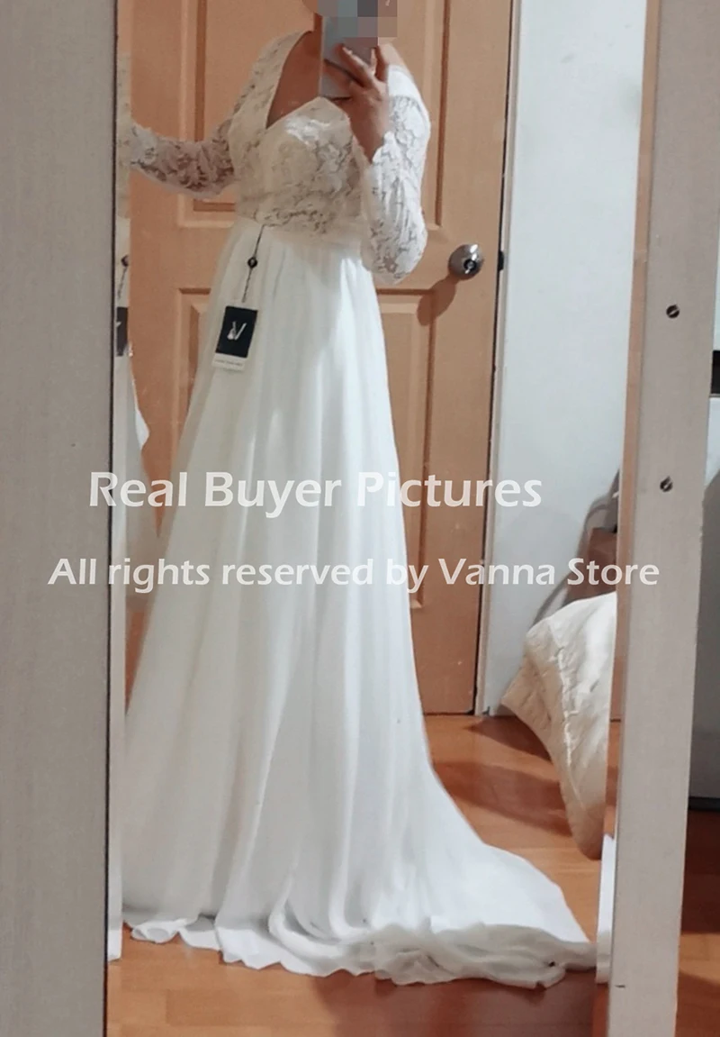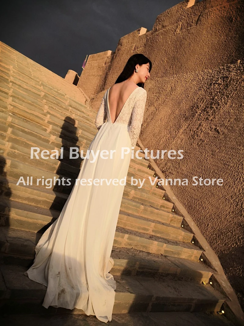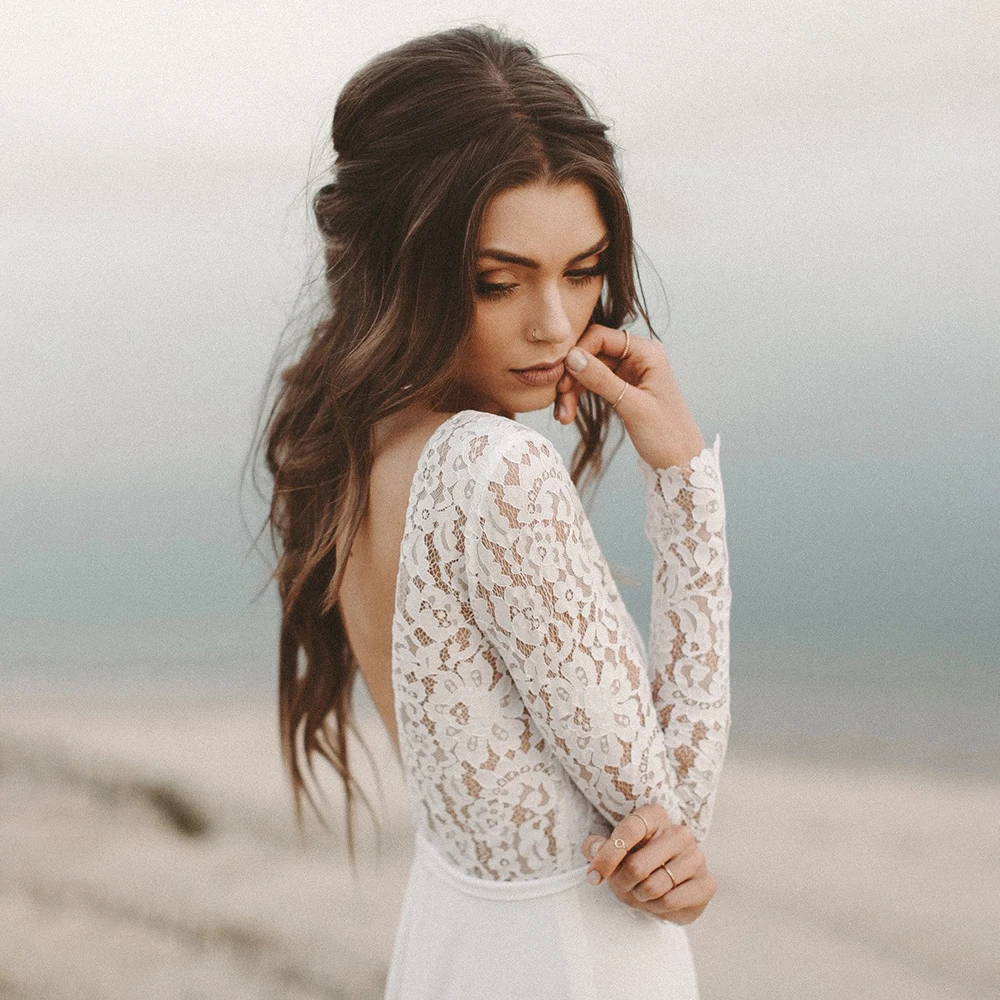 Кружевное свадебное платье в стиле бохо, с длинными рукавами, Пляжное, ТРАПЕЦИЕВИДНОЕ, с открытой спиной, размера плюс, с V-образным вырезом, шифоновое, в деревенском стиле, индивидуальное