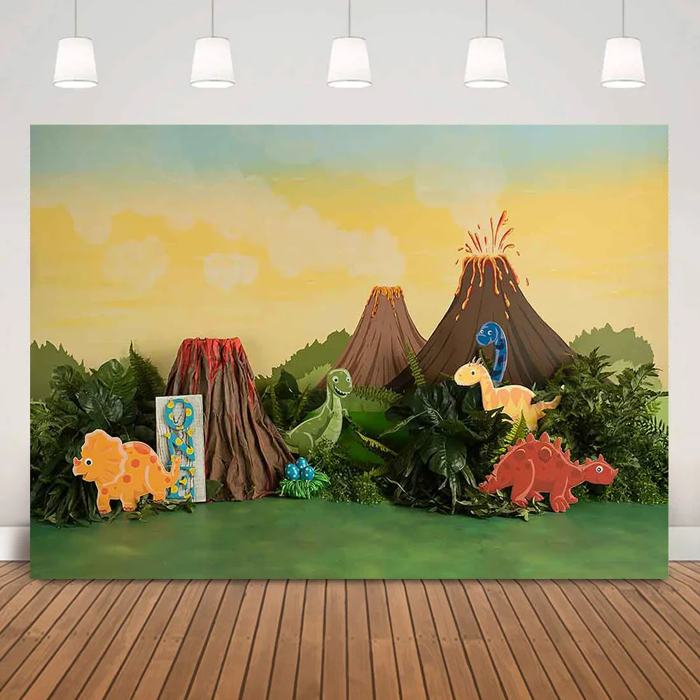 Фон для студийной фотосъемки новорожденных с изображением джунглей динозавров вулканического леса торта на день рождения