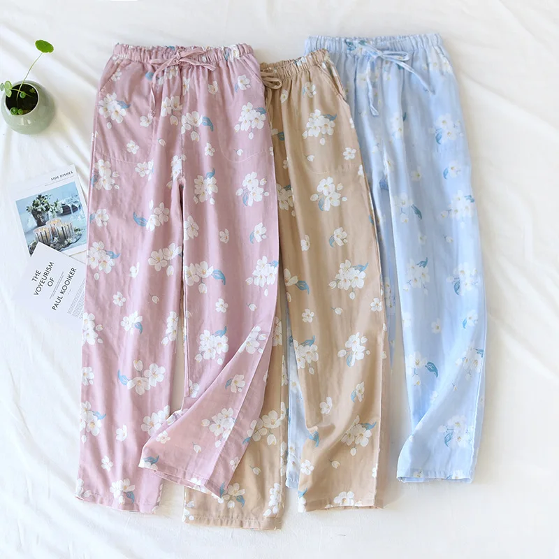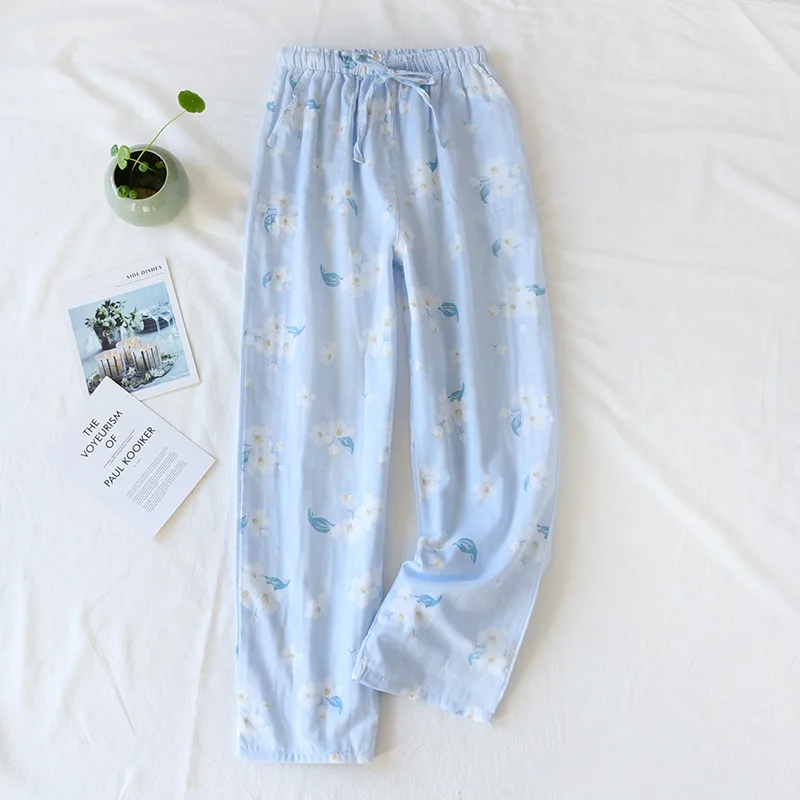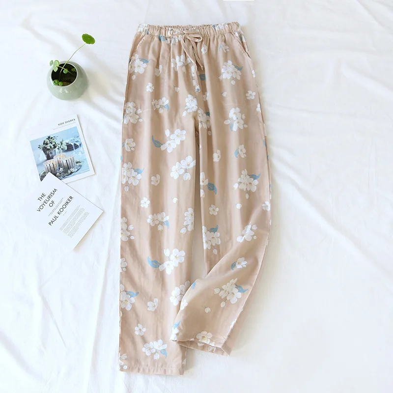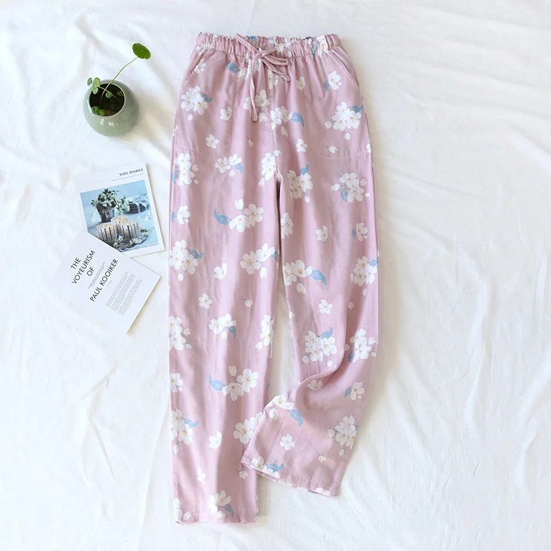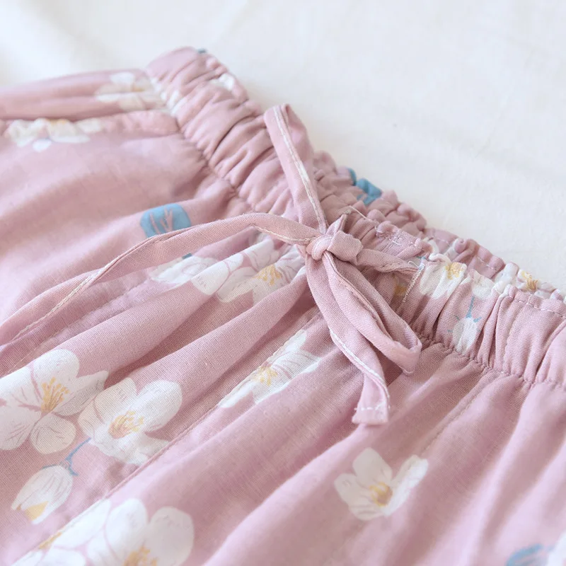 Женские летние босоножки, для сна, нательное белье 100% хлопковый с цветочным принтом, одежда для дома с двойным Слои марли хлопка домашние брюки с эластичной резинкой на талии; Одежда для сна