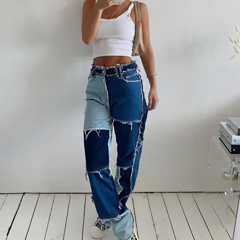 Женские джинсы в стиле пэчворк, винтажные прямые джинсовые брюки с ...