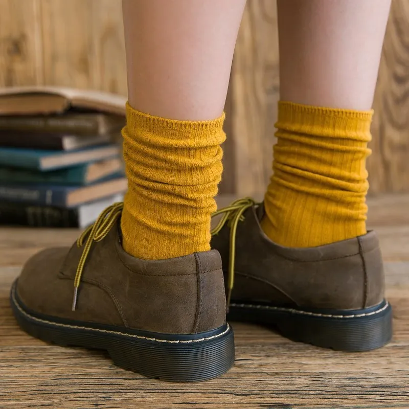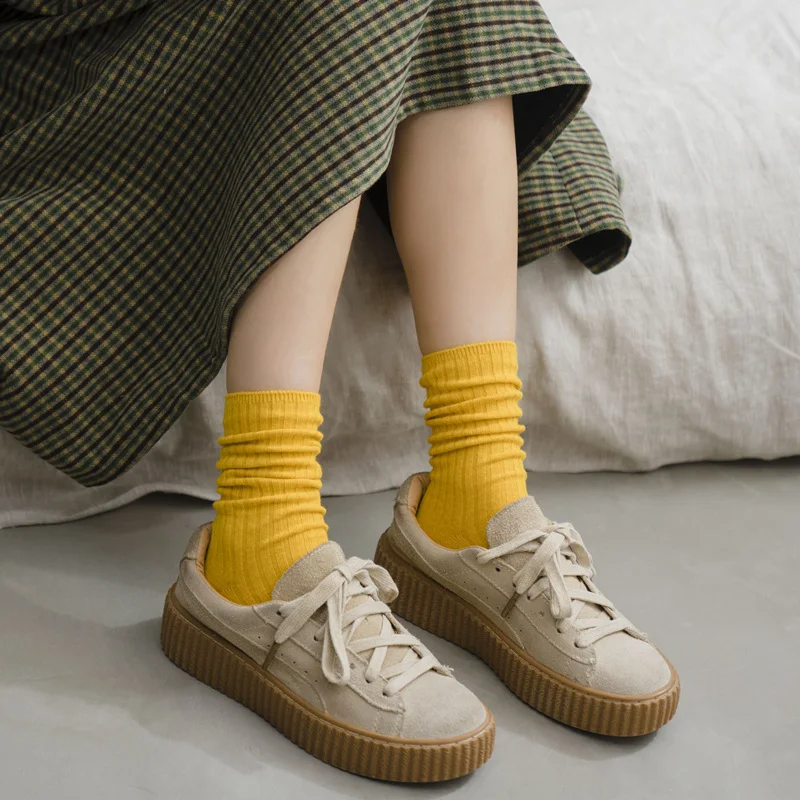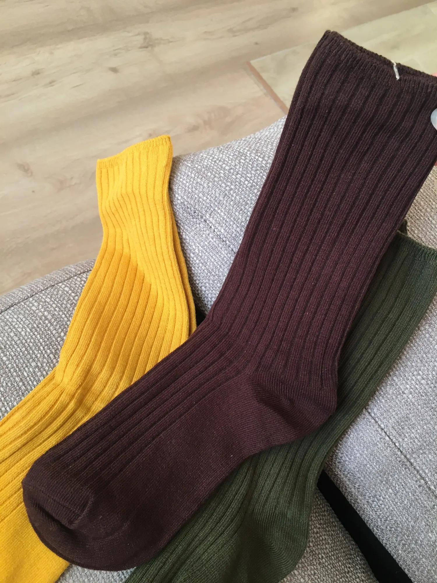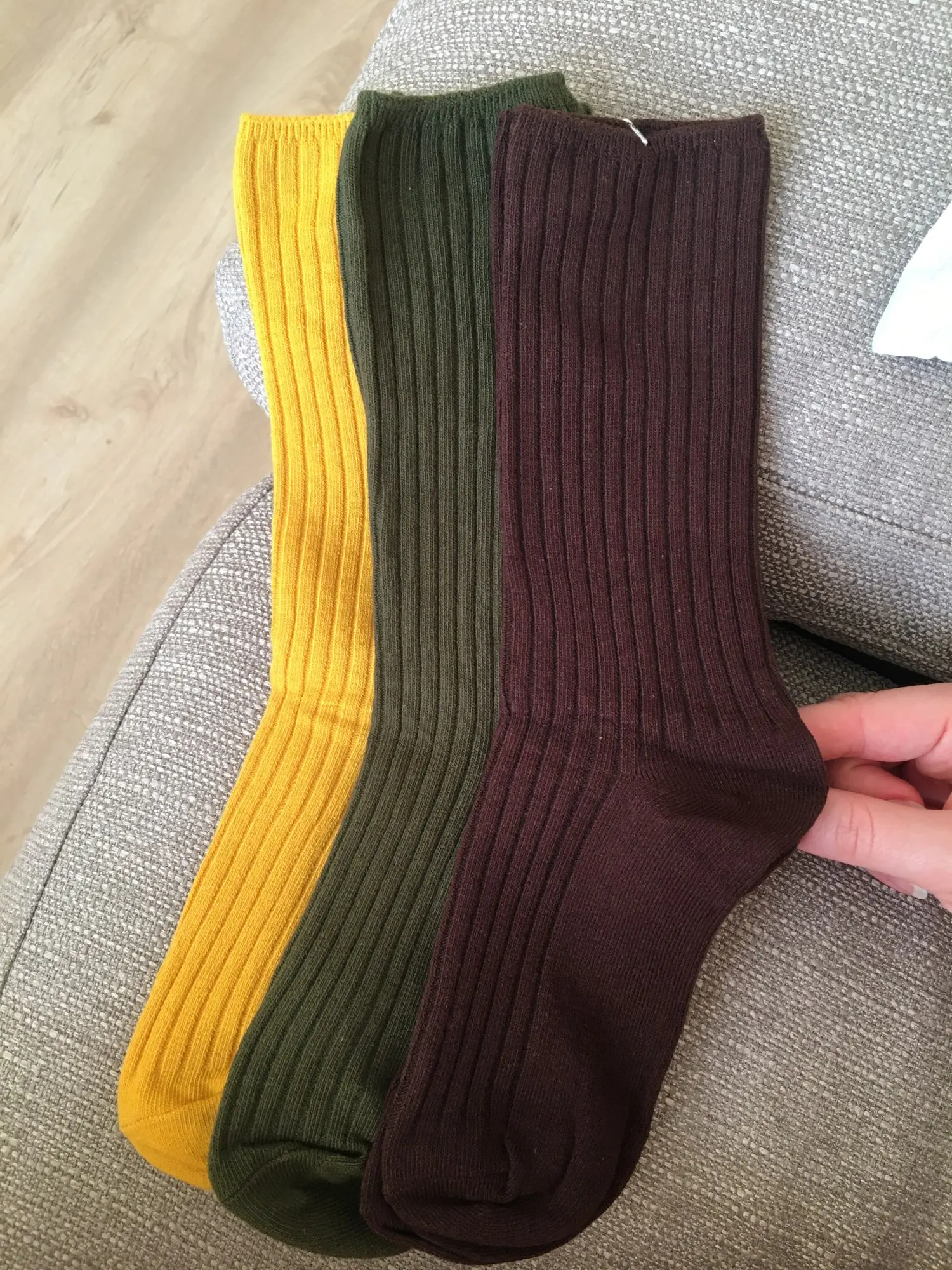 Носки CHAOZHU 3 парыкомпл. Женские базовые, хлопковые однотонные в японском стиле, свободного покроя, в рубчик, цвета хаки, розового, желтого цветов, для 4 сезонов