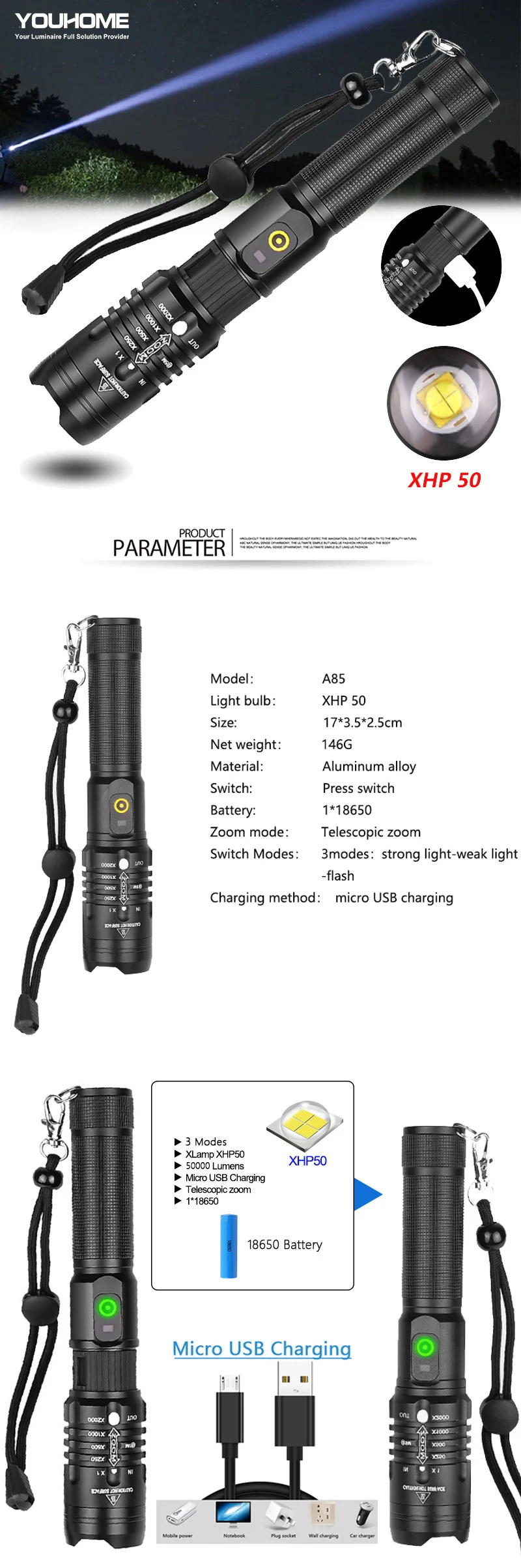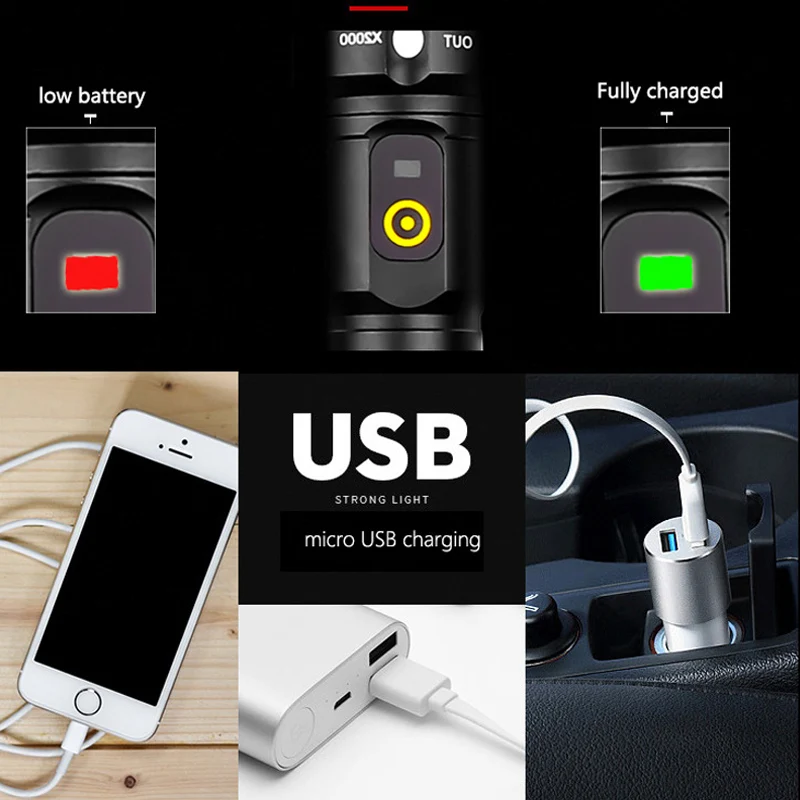Сверхмощный светодиодный фонарик XHP50, ручной фонарь, водонепроницаемый фонарь, перезаряжаемый через USB, ультра яркий фонарь для кемпинга, охоты