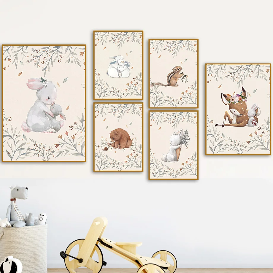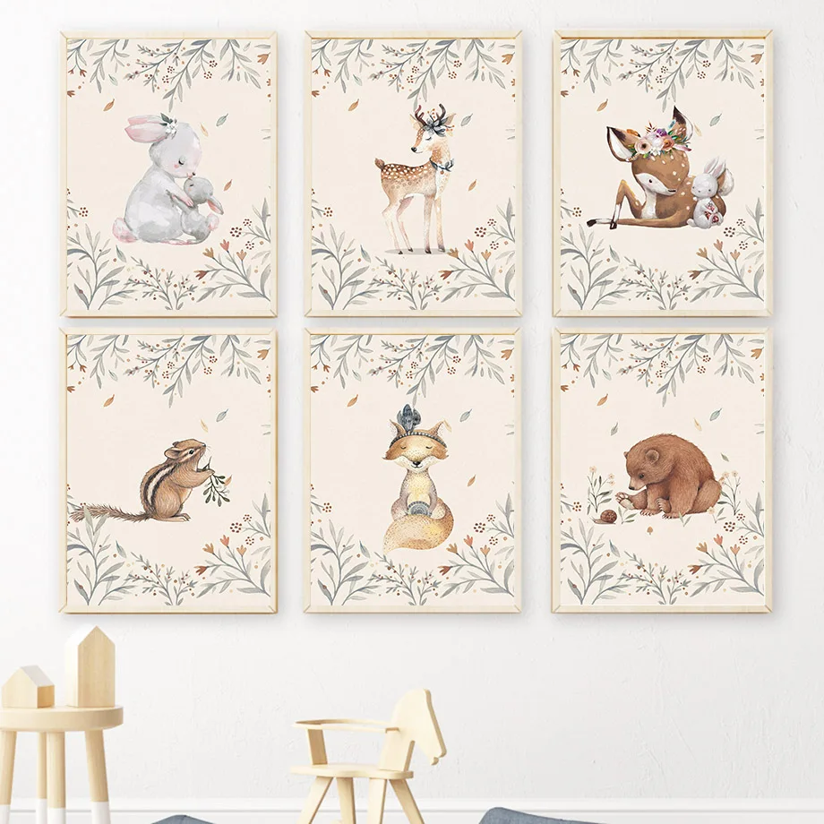 Настенная картина для детской комнаты с изображением оленя, кролика, лисы, белки, медведя, животных, постеры и принты на холсте в скандинавском стиле, настенные картины, декор для детской комнаты