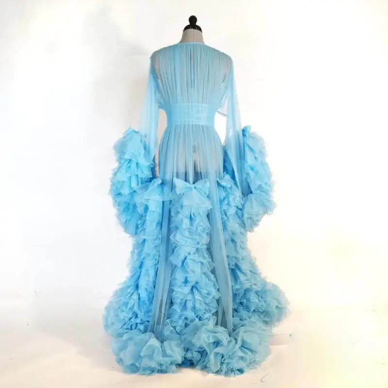 Видеть через небесно-голубое платье с фатиновой юбкой Для женщин платья для детского дня рождения одежда свадебное платье многоуровневые оборки кимоно с рукавами Платья для вечеринок с бантом Пышная юбка