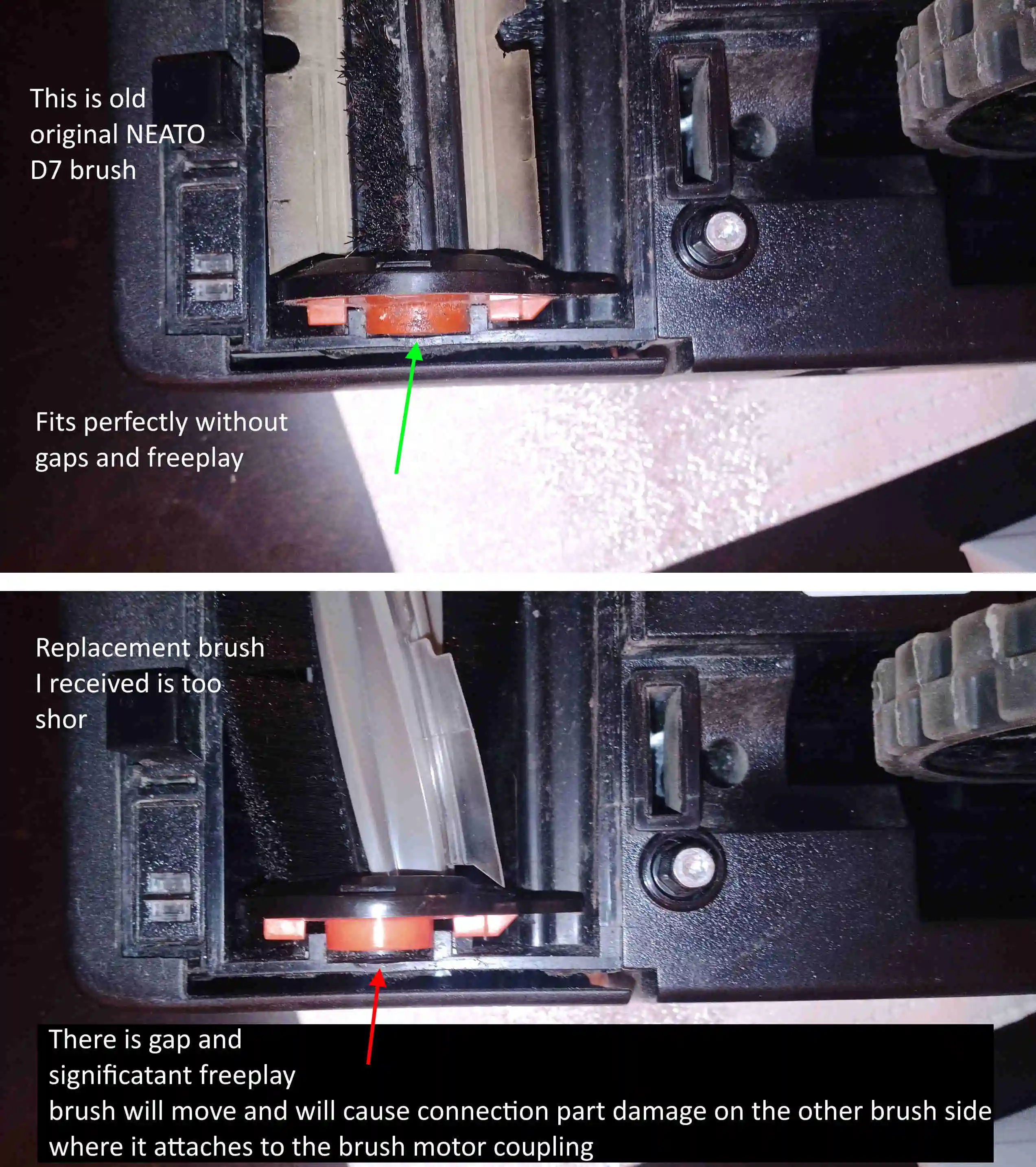 Непригодный для использования с NEATO Botvac D7, причины: пылевой фильтр не хватает достаточного воздушного потока, поскольку он покрыт жестким пластиковым ситом со слишком меньшим количеством отверстий и не соответствует фильтру, обещанного в списке продавцов. Щетки силиконовые лезвия слишком узкие и не достигают пола. Щетки силиконовые лезвия черенки неточны, лезвия изгиба на корпусе ребра. Щетина кисти слишком широкая, продолжает тереть о стены корпуса, вызывая 'кисть застряла error'. Кисть слишком короткая, имеет большой зазор и freeplay.