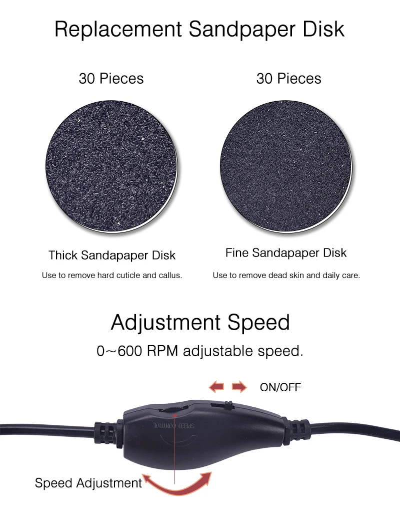 1. Вращение на 360 градусов для удаления пятки стопы сухой, омертвевшей кожи, мозолей.2. Легко контролировать его скорость по вашему запросу, быстро или медленно, более удобно.3. Со сменным наждачным диском, один человек один диск, более 4. Здоровый и гигиеничный.4. Небольшой размер, легко носить с собой, когда вы находитесь в путешествии или отпуске.5. Безопасное и быстрое удаление, идеально подходит для маникюрного салона семейного использования.