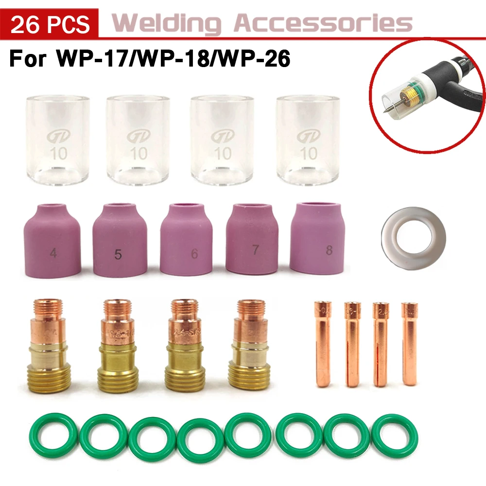 26 шт., сварочные принадлежности для горелок, газовая линза TIG #10 Pyrex, чашка Tig, алюминиевые сопла для Tig WP17/WP18/WP26Спецификация: