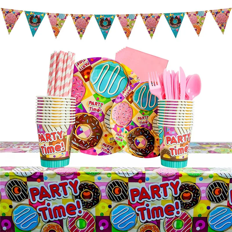 Украшение в виде пончика, детская одноразовая посуда, бумажные таре...