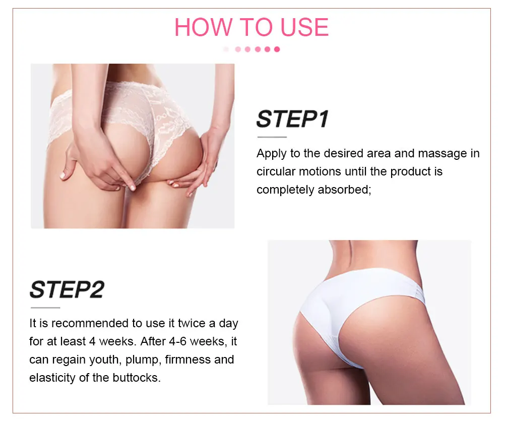 Шаг 2: рекомендуется использовать его два раза в день не менее 4 недель. Через 4-6 недель, он может вернуть молодость, пухлые, упругость и эластичность ягодиц.