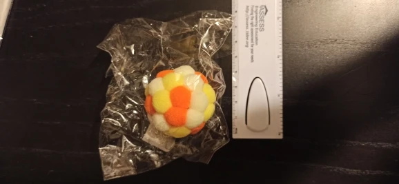 Игрушка очень классная. Кот сразу же с ней начал играться. Внутри маленький шарик который звенит. Размер небольшой. Все супер.