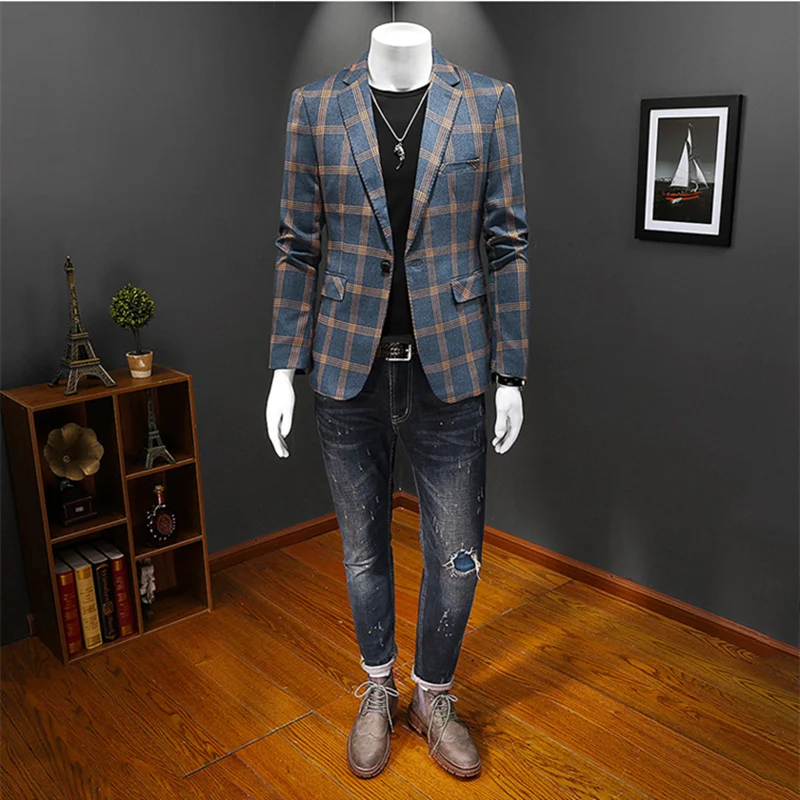 Бренд Мужской приталенный пиджак, 2021 Демисезонный клетчатый блейзер Мужской 5XL Повседневный клубный пиджак для мужчин, деловые формальные клетчатый пиджак Q192