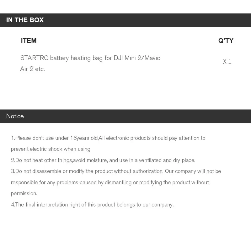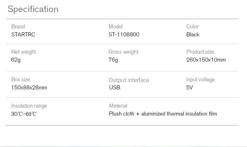 Бренд: STARTRCМодель: st-1108800Цвет: черныйВес нетто: 62 гВес брутто: 76 гРазмер изделия: 260x150x10ммРазмер коробки: 150x88x28ммВыходной интерфейс: USBВходное напряжение: 5 ВДиапазон изоляции: 30 ℃-60 ℃Материал: плюшевая ткань + алюминиевая теплоизоляционная пленка【 1. Не хотите повредить аккумулятор во время полета зимой?Выберите startrc нагревательный мешок батареиПусть ваш Дрон будет лететь безопасно в холодную зиму【 2 】 он используется для нагрева батареи и сохранения тепла. Когда летает Дрон зимой, потому что температура ниже зимой, активность литий-ионного литиевого аккумулятора уменьшается, в результате, эффективность питания аккумулятора снижена, а выходная мощность снижена, что не может соответствовать требованиям номинального напряжения drone' s.Когда источник питания дрона недостаточен, это приведет к ситуации недостаточной кинетической энергии. В то же время, когда температура слишком низкая, а напряжение очень низкое, очень легко вызвать крушение дрона.Нагревательная сумка Startrrc drone может помочь решить серьезные проблемы, она может поддерживать батарею при нормальной температуре, уменьшать внутреннее сопротивление батареи и восстанавливать нормальную производительность разряда.【 3 】Large емкость и широкий спектр примененияОн может нагреваться и изолироваться для всех видов моделей летательных аппаратов.Большая емкость, надежное хранение【 4 】 складной, легко носить с собойПосле складывания он компактен и не занимает места, поэтому его удобнее носить【 5 】 легко использовать и безопасноПодключите мобильный источник питания или блок питания 5В 2A для нормальной работыВысокая температура-Автоматическое выключение питания, низкая температура-автоматическое нагревание, высокая безопасность【 6 】 высококачественный материалПровод принимает низкотемпературный термостойкий провод, который является холодостойким, износостойким и прочным【 7 】 производительность разряда батареи может быть эффективно восстановлена при низкой температуреКак использовать батарею зимой?1. Перед полетом, пожалуйста, зарядите полную батарею, чтобы подтвердить, что батарея находится в высоковольтной ситуации2. Подогрейте аккумулятор до более чем 25 ℃, чтобы уменьшить внутреннее сопротивление батареи. Аккумулятор можно предварительно нагревать, положив его в нагревательный пакет startrc.3. После снятия, удерживайте Дрон парящий около 1 минуты, чтобы позволить батарее использовать внутреннее тепло, чтобы уменьшить внутреннее сопротивление.4. При полете при низкой температуре попробуйте контролировать время полета при половину нормальной температуры для обеспечения безопасного полета.Уведомление1. Пожалуйста, не используйте до 16 лет, все электронные продукты должны обратить внимание на предотвращение электрического удара при использовании2. Не нагревайте другие вещи, Избегайте влаги и используйте в проветриваемом и сухом месте.3. Не разбирайте и не изменяйте продукт без разрешения. Наша компания не будет нести ответственность за любые проблемы, вызванные демонтажем или модификацией продукта без разрешения.4. Окончательная интерпретация права этого продукта принадлежит нашей компании.