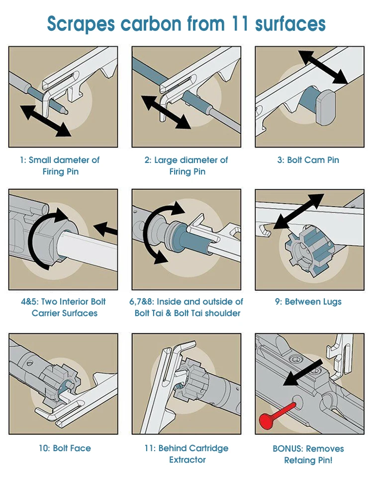 Регулярное использование быстро создает углерод на болтах и кольцах. Движущиеся части требуют точного соскабливания, поэтому мы разработали скребок- Первый скребок предназначен для очистки 12 критических поверхностей на группе болтов. Инновационный двусторонний поворотный дизайн экономит время, быстро и легко удаляя углерод из всей группы болтов. Карбон только что сбегал из мест, где можно спрятаться.