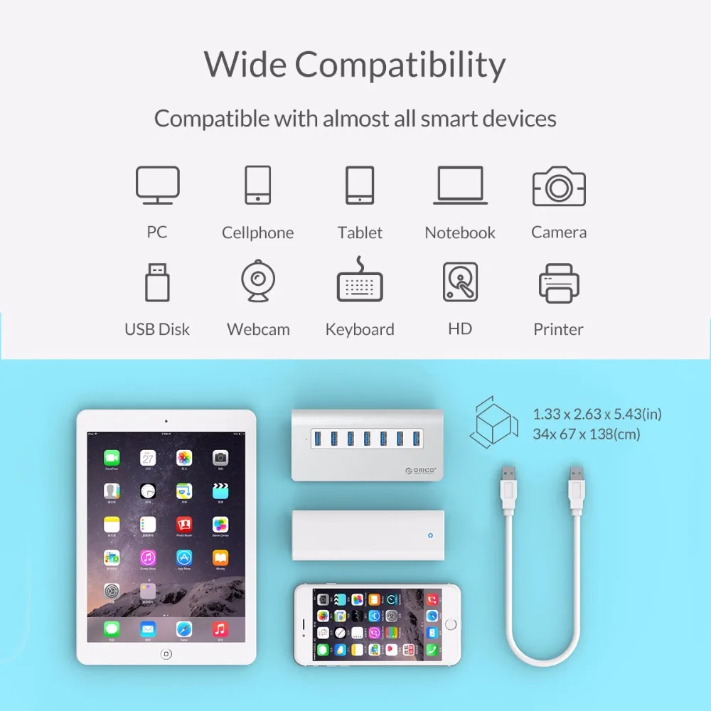 ORICO 7 Порты и разъёмы USB 3,0 концентратор, украшенное мозаикой из драгоценных камней, 12V Мощность адаптер OTG Разветвитель USB Сервер печати мульти Порты и разъёмы расширитель репликатора компьютерные аксессуары