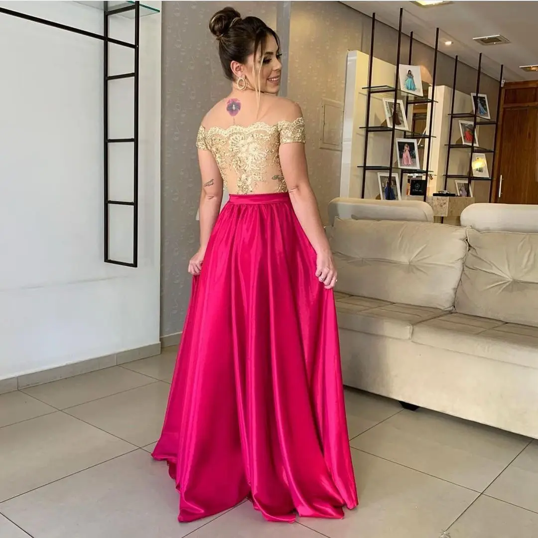 HONGFUYU атласное платье для выпускного вечера с открытыми плечами ние трапециевидные Длинные фуксия кружевной топ вечерние платья vestido de fiesta вечернее платье