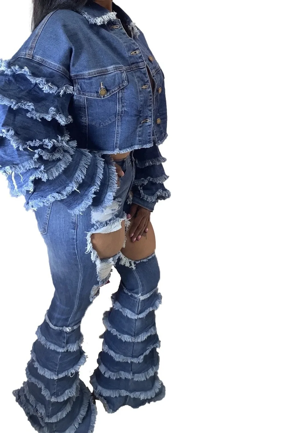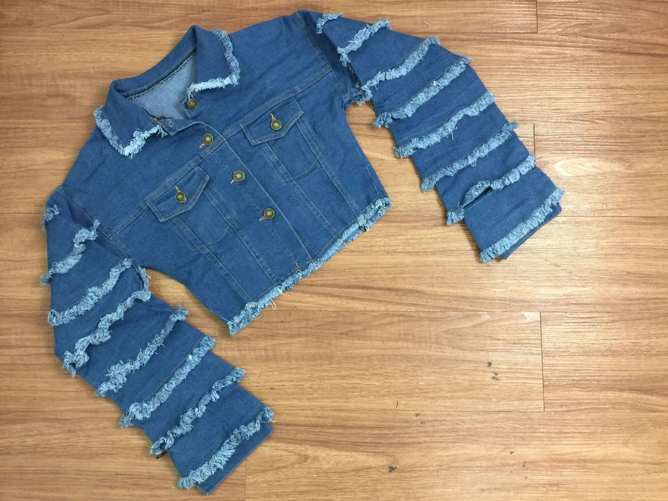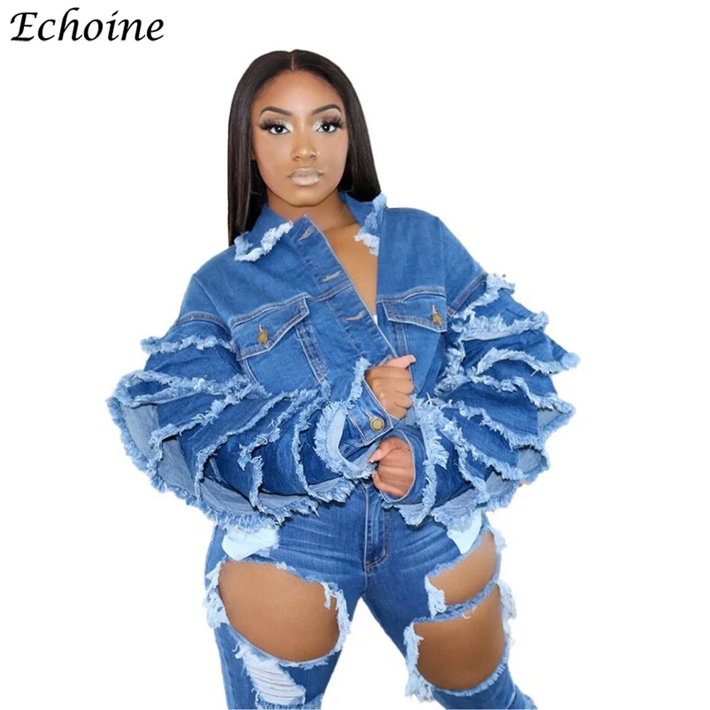 Пикантная джинсовая куртка с рюшами, женский укороченный Топ с длинным рукавом, женская модная стеганая одежда с карманами на пуговицах, зима-весна, одежда для вечеринок