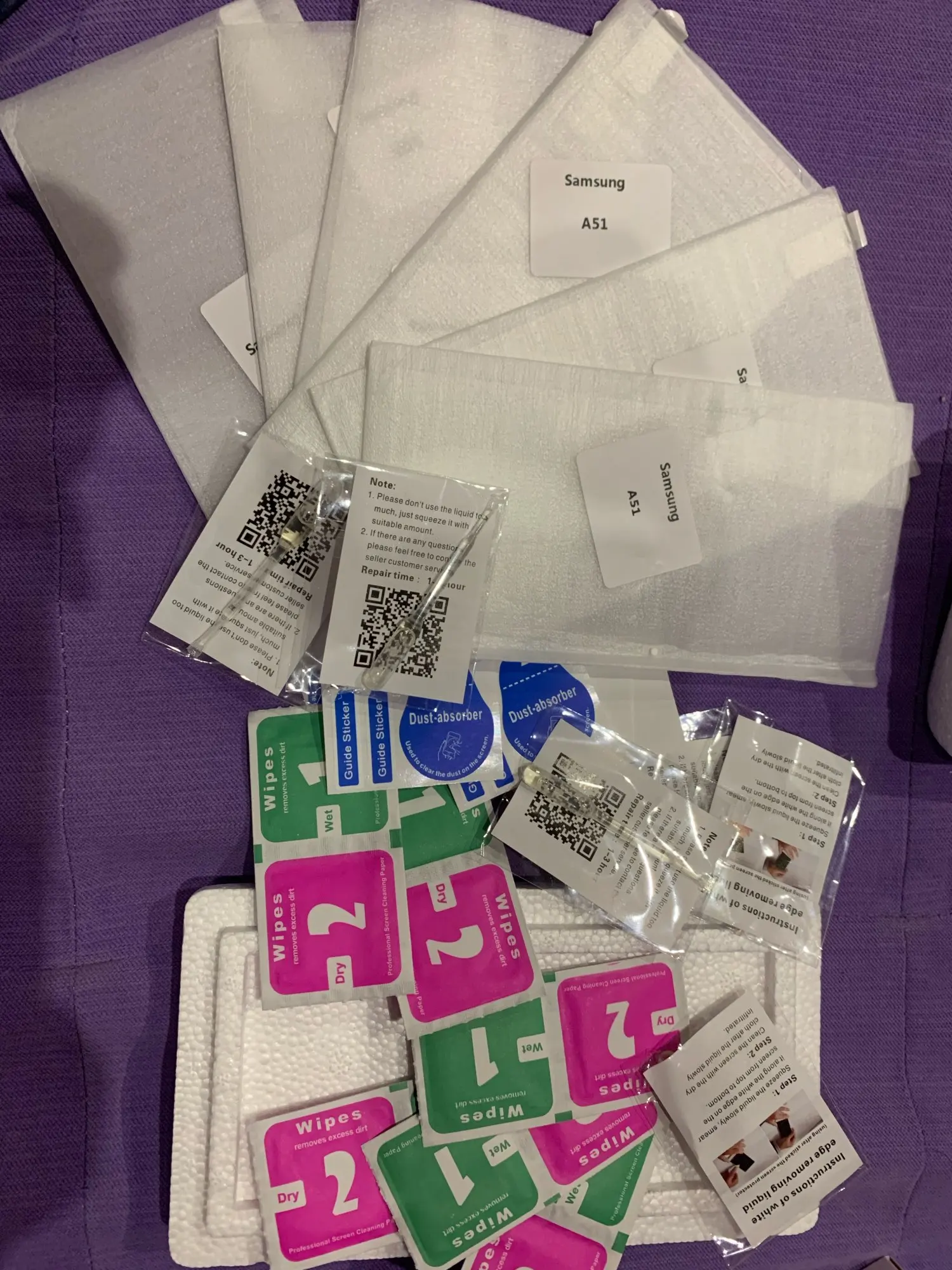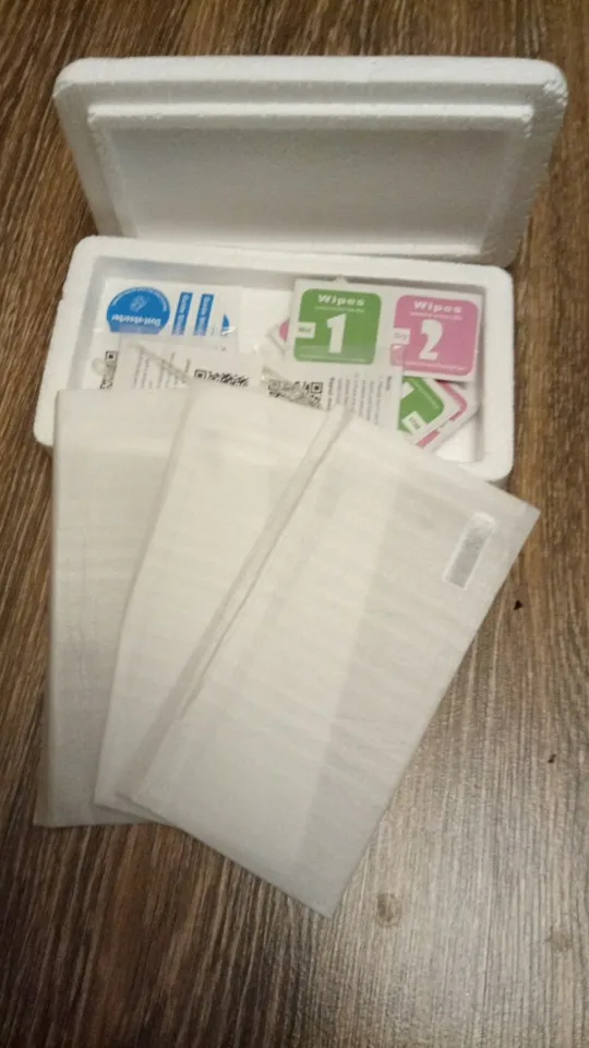 в приложении к стеклу есть две салфетки с номерацией и капсула с жидкостью для обезжиривания экрана.