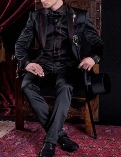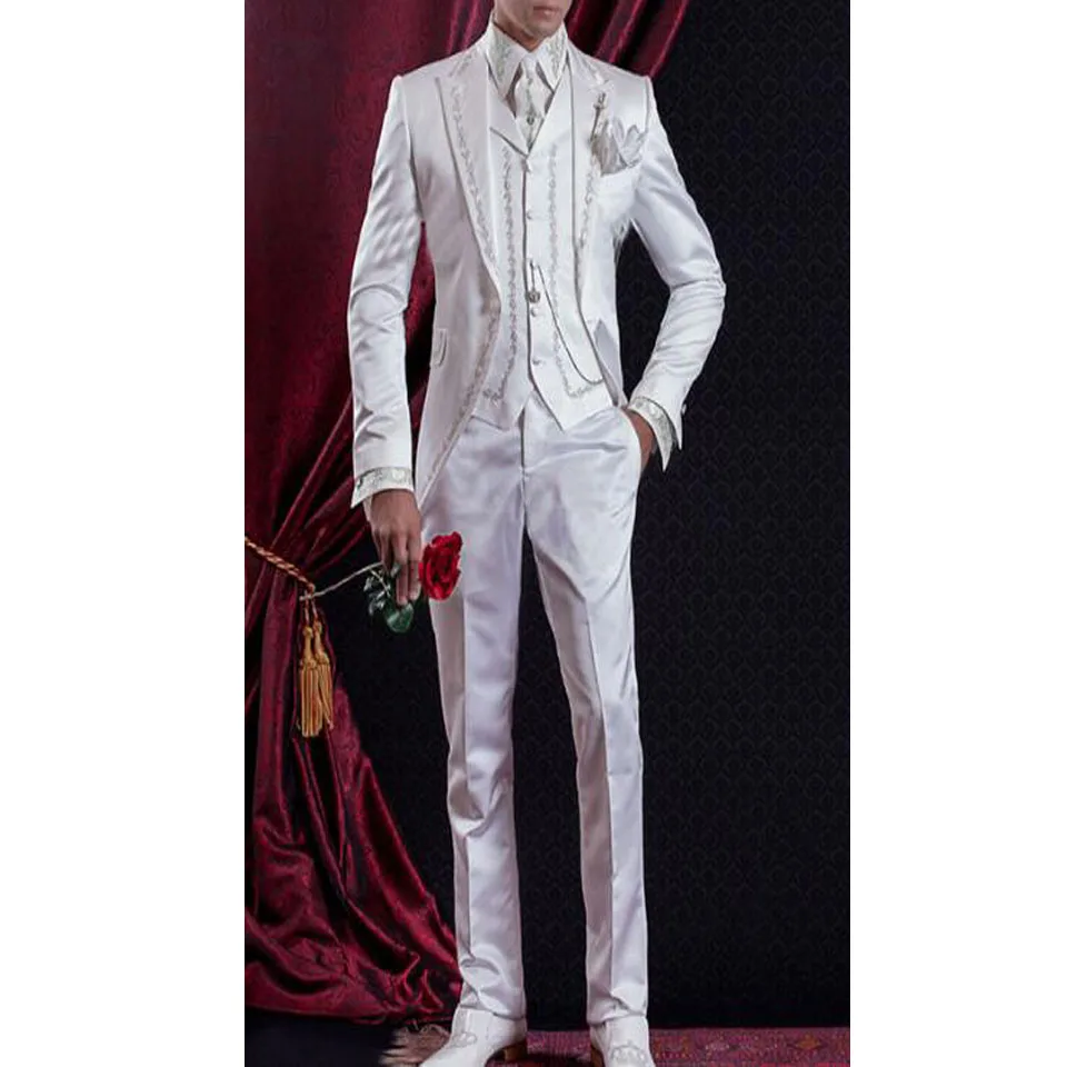 2020 Винтажные белыечерные мужские костюмы в стиле жениха принца, мужские костюмы со стоячим воротником, модная одежда (куртка + брюки + жилет)