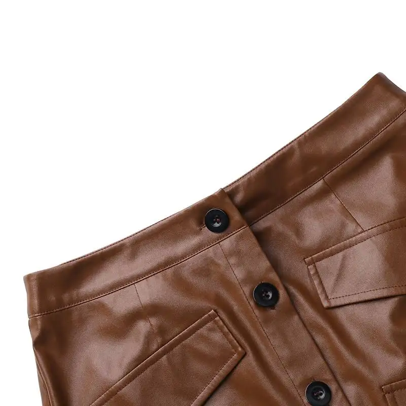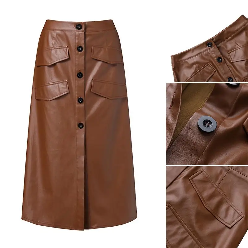 Материал: 100% полиэстерЦвет: черный, винно-красный, коричневыйПосылка входит: 1 юбкаДетали продукта:-Многоцветный-Кожаная юбка-Декоративные карманы-Пуговицы спереди