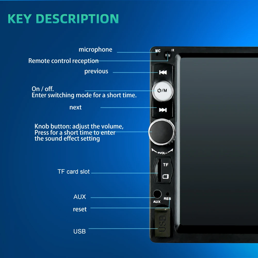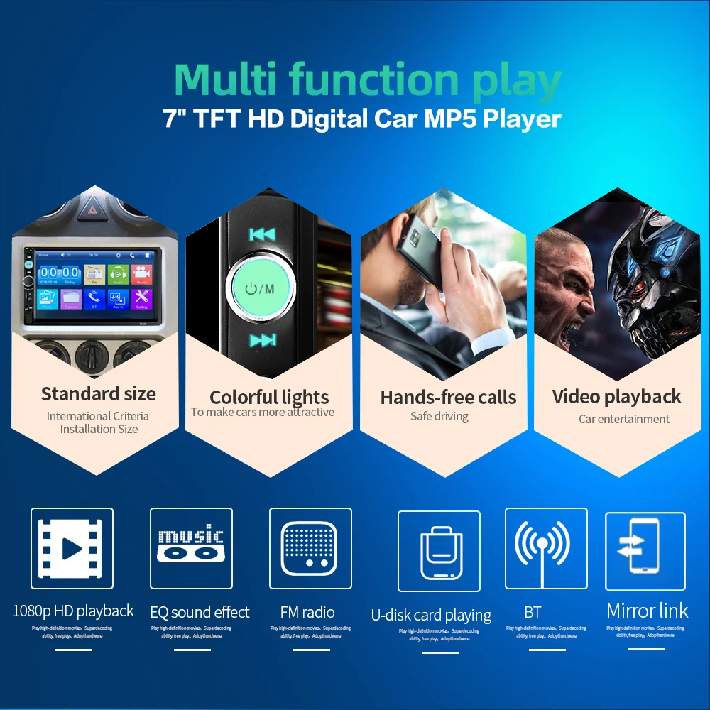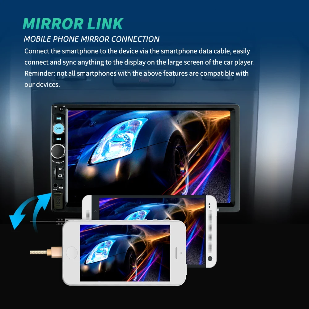 Спецификация: Цвет: черный 7-дюймовый сенсорный экран Поддержка подключения смартфона Подключите смартфон к устройству через кабель передачи данных смартфона, Легко Подключите и синхронизируйте любой контент с автомобильным плеером, отображаемым на большом экране. Напоминание: не все смартфоны с вышеуказанными функциями совместимы с нашим оборудованием. Для получения подробной информации обратитесь в службу поддержки клиентов магазина. Если вы возражаете, будьте осторожны при покупке. Встроенный Bluetooth + микрофон Поддержка громкой связи Воспроизведение фильмов высокой четкости Поддержка формата видео: RMVB/RM/FLV/3GP/MPEG/DIVX/XVID/DAT/VOB/AVI/MP4 Поддержка аудиоформатов: MP3/WMA/OGG/APE/AAC/FLAC/WAV Поддержка формата изображения: JPG Поддержка настройки языков меню Интерфейс: USB / TF / AUX Автоматическое преобразование цветных огней. 24 часа цифровые часы, дата. Поддержка выходной мощности может заряжать мобильный телефон или другое USB-устройство. Поддержка функции FM. (частота: 87,5-108 МГц) Поддержка запоминающего устройства: USB-диск/устройство с TF-картой Аудиовход AUX Функция камеры заднего вида Дистанционное управление Входное напряжение: 12 В постоянного тока
