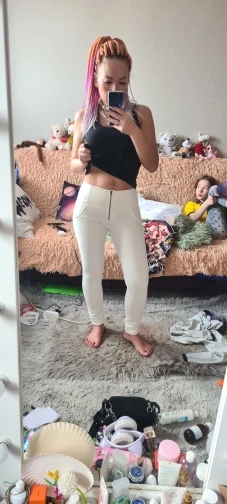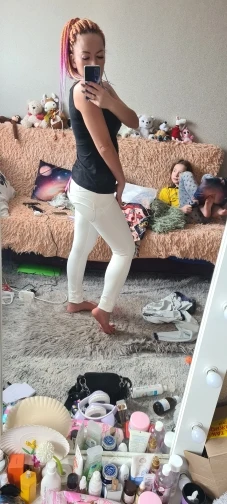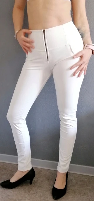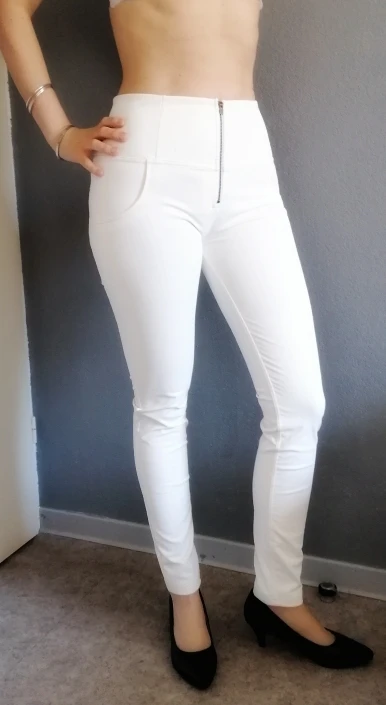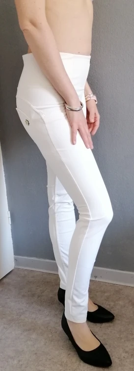 Черная молния спереди очень уродливая в этих белых штанах и удобно скрывается на фотографиях.