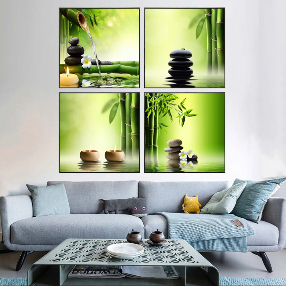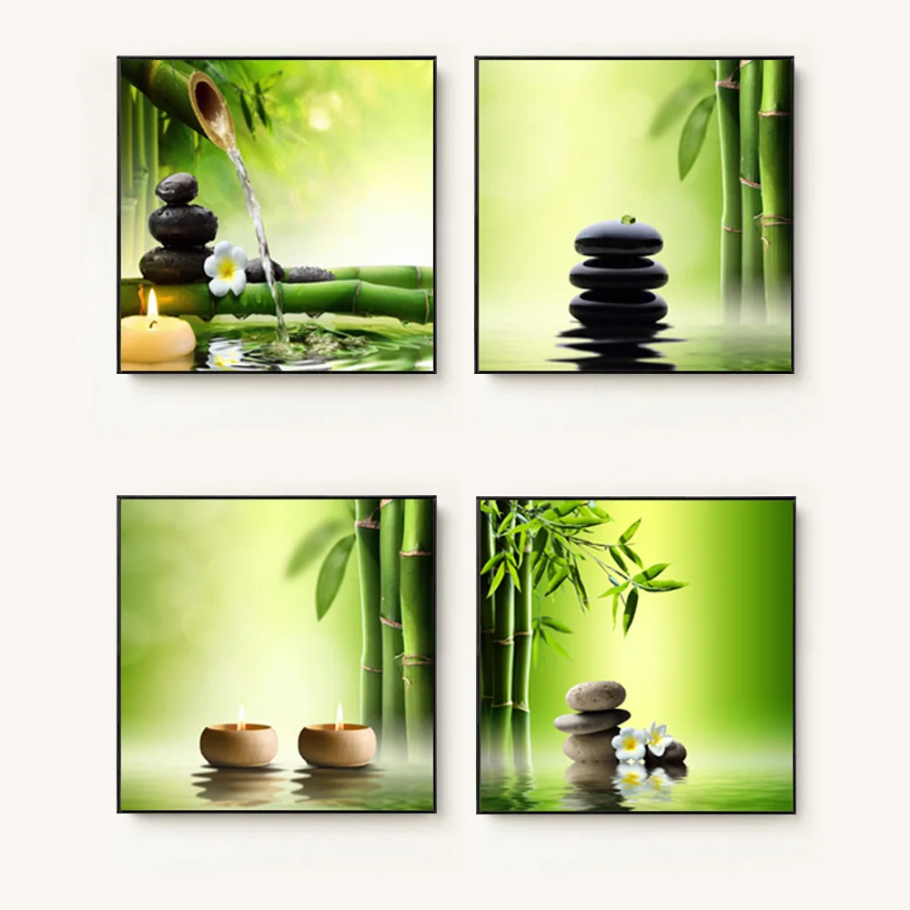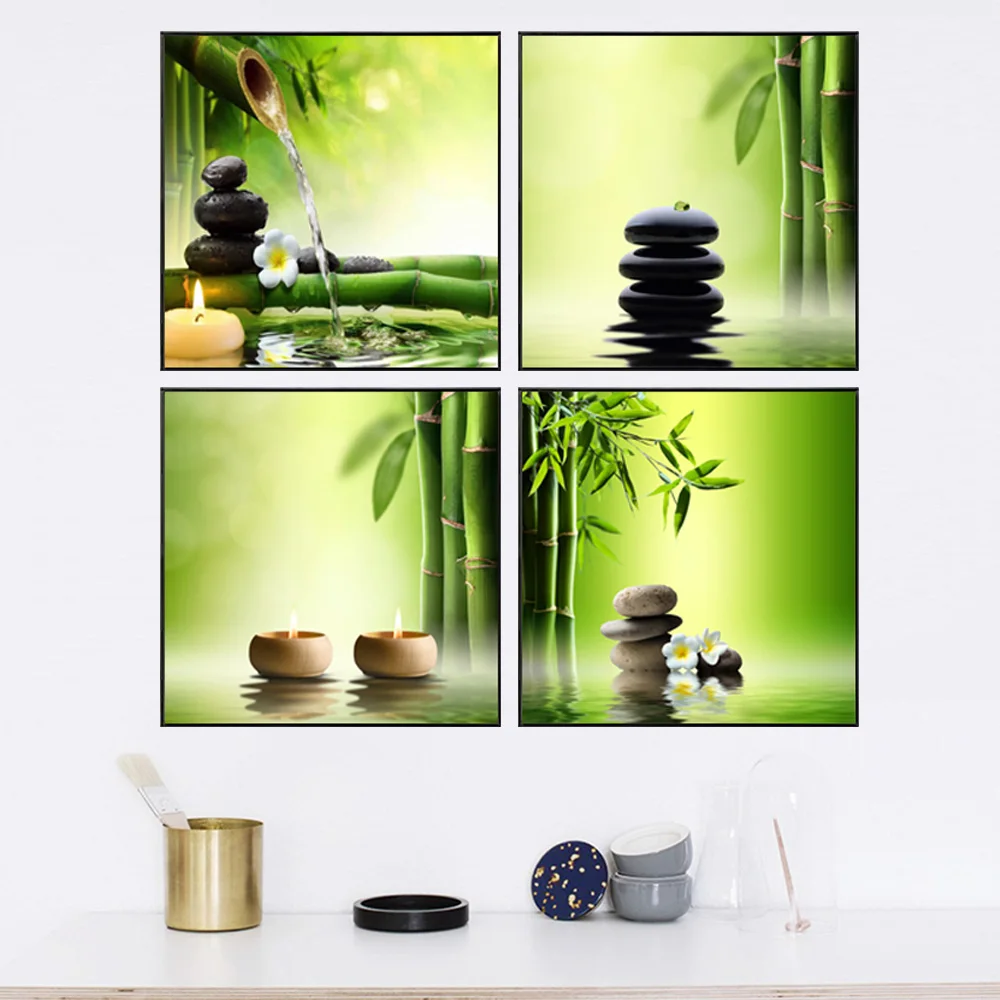 Современные постеры из зеленого бамбука дзен в виде свечи, 4 панели, принты, религиозные изображения на холсте, настенная живопись для украшения гостиной