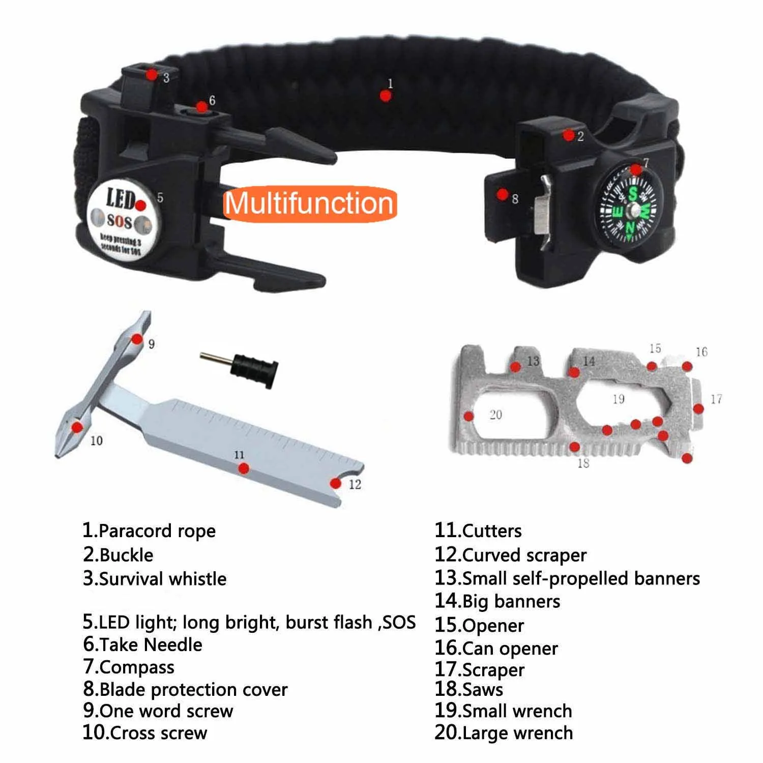Function includedWhistle,Compass,bracelet, SOS LED, wire saw,mini knife,SIM pin